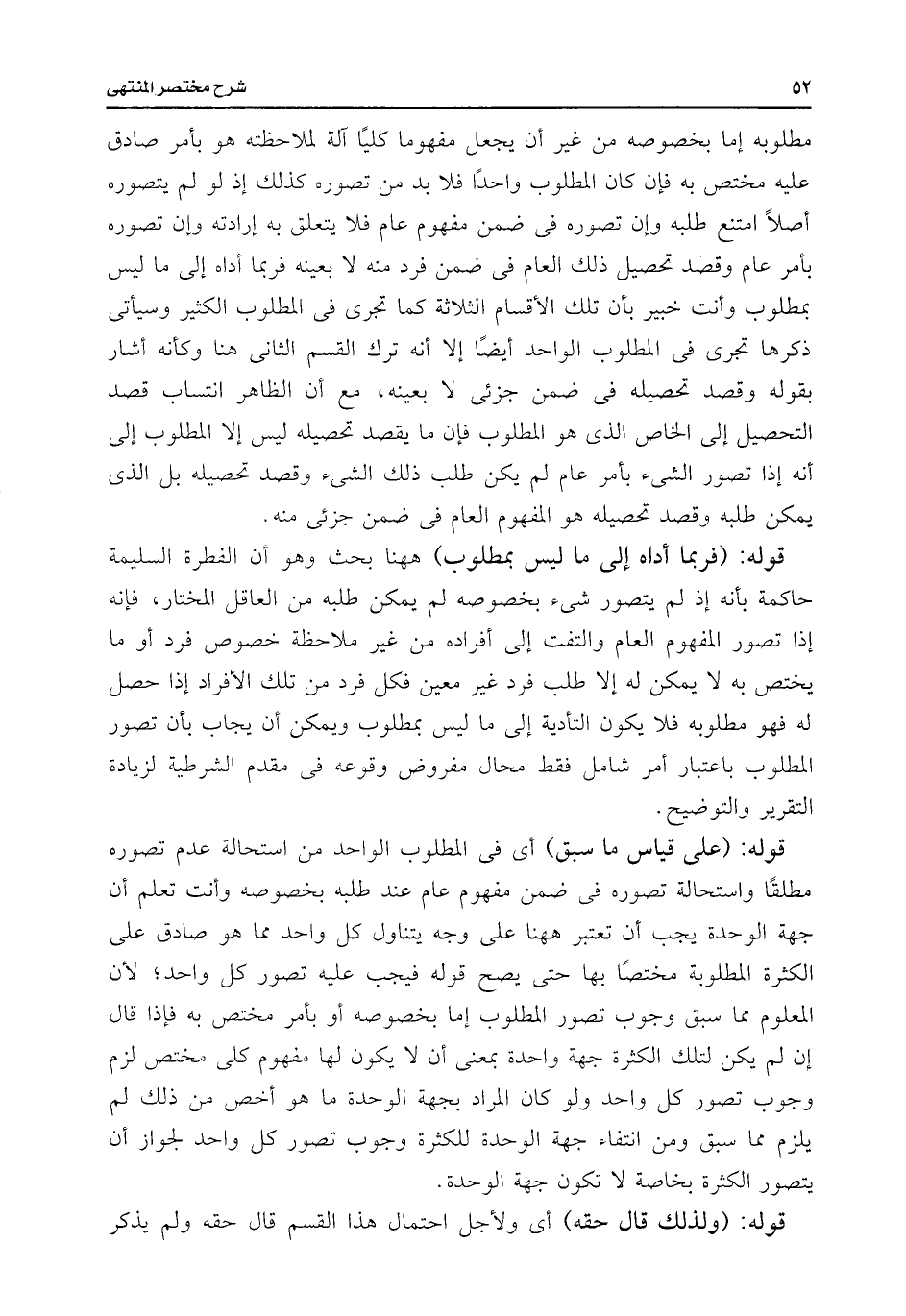 مطلوبه إما بخصوصه من غير أن يجعل مفهوما كليًا آلة لملاحظته هو بأمر صادق عليه مختص به فإن كان المطلوب واحدًا فلا بد من تصوره كذلك إذ لو لم يتصوره أصلًا امتنع طلبه وإن تصوره فى ضمن مفهوم عام فلا يتعلق به إرادته وإن تصوره بأمر عام وقصد تحصيل ذلك العام فى ضمن فرد منه لا بعينه فربما آداه إلى ما ليس بمطلوب وأنت خبير بأن تلك الأقسام الثلاثة كما تجرى فى المطلوب الكثير وسيأتى ذكرها تجرى فى المطلوب الواحد أيضًا إلا أنه ترك القسم الثانى هنا وكأنه أشار بقوله وقصد تحصيله فى ضمن جزئى لا بعينه، مع أن الظاهر انتساب قصد التحصيل إلى الخاص الذى هو المطلوب فإن ما يقصد تحصيله ليس إلا المطلوب إلى أنه إذا تصور الشئ بأمر عام لم يكن طلب ذلك الشئ وقصد تحصيله بل الذى يمكن طلبه وقصد تحصيله هو المفهوم العام فى ضمن جزئى منه.
