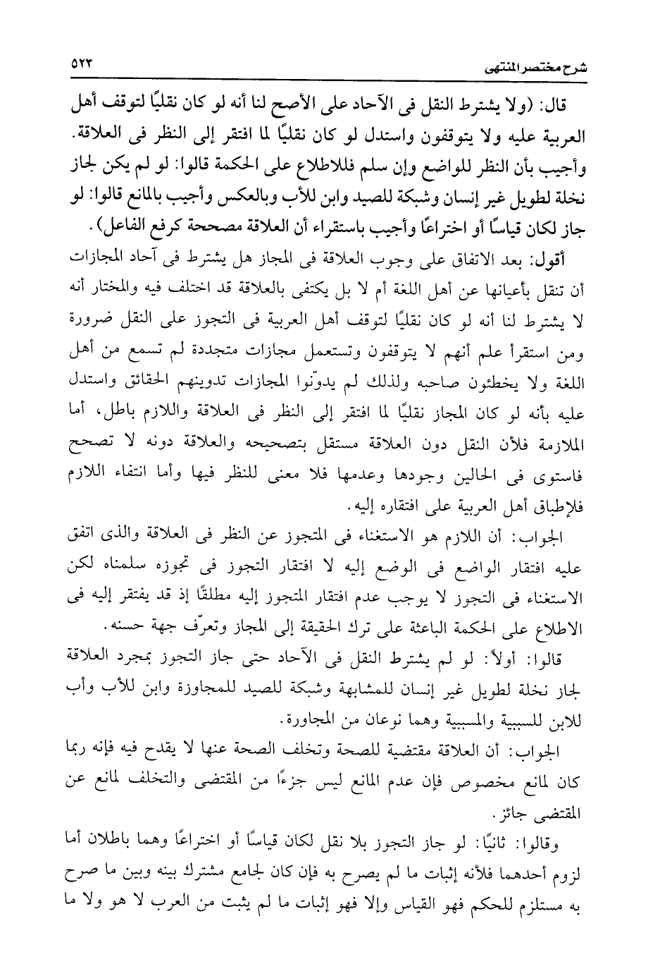 قالوا: أولًا: لو لم يشترط النقل فى الآحاد حتى جاز التجوز بمجرد العلاقة لجاز نخلة لطويل غير إنسان للمشابهة وشبكة للصيد للمجاوزة وابن للأب وأب للابن للسببية والمسببية وهما نوعان من المجاورة.