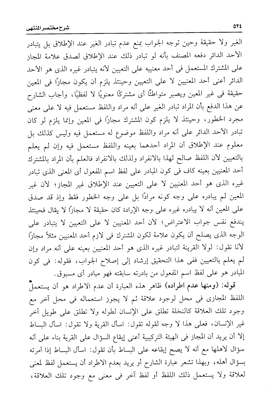 قوله: (ومنها عدم اطراده) ظاهر هذه العبارة أن عدم الاطراد هو أن يستعمل اللفظ المجازى فى محل لوجود علاقة ثم لا يجوز استعماله فى محل آخر مع وجود تلك العلاقة كالنخلة تطلق على الإنسان لطوله ولا تطلق على طويل آخر غير الإنسان، فعلى هذا لا وجه لقوله تقول: اسأل القرية ولا تقول: اسأل البساط إلا أن يريد أن المجاز فى الهيئة التركيبية أعنى إيقاع السؤال على القرية بناء على أنه سؤال لأهلها مع أنه لا يصح إيقاعه على البساط بأن تقول: اسأل البساط إذا أمرته بسؤال أهله، وبهذا تشعر عبارة الشارح أو يريد بعدم الاطراد أن يستعمل لفظ لمعنى لعلاقة ولا يستعمل ذلك اللفظ أو لفظ آخر فى معنى مع وجود تلك العلاقة،