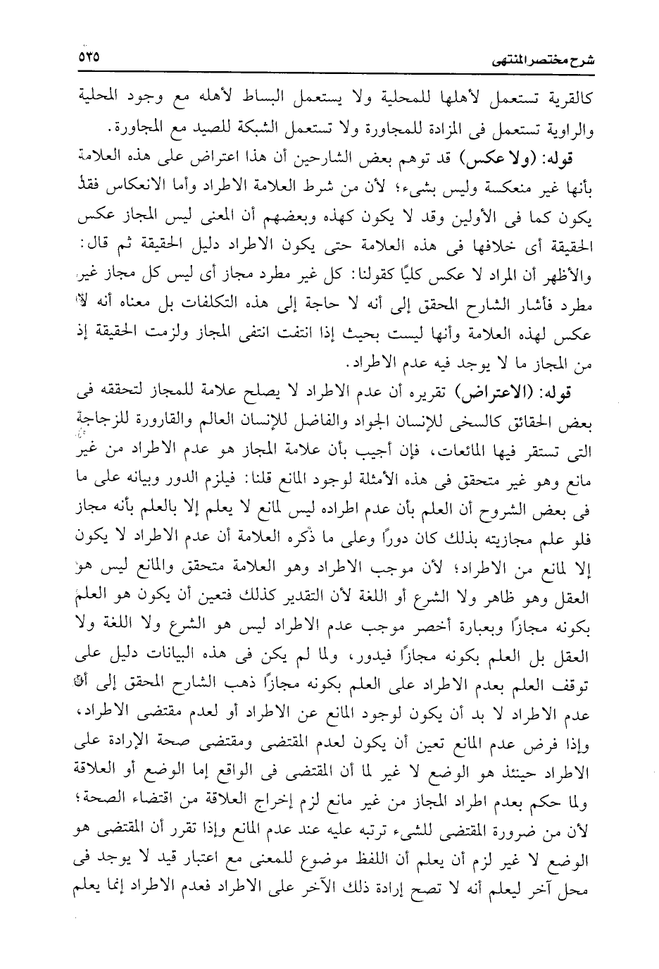 قوله: (ولا عكس) قد توهم بعض الشارحين أن هذا اعتراض على هذه العلامة بأنها غير منعكسة وليس بشئ؛ لأن من شرط العلامة الاطراد وأما الانعكاس فقد يكون كما فى الأولين وقد لا يكون كهذه وبعضهم أن المعنى ليس المجاز عكس الحقيقة أى خلافها فى هذه العلامة حتى يكون الاطراد دليل الحقيقة ثم قال: والأظهر أن المراد لا عكس كليًا كقولنا: كل غير مطرد مجاز أى ليس كل مجاز غير مطرد فأشار الشارح المحقق إلى أنه لا حاجة إلى هذه التكلفات بل معناه أنه لا عكس لهذه العلامة وأنها ليست بحيث إذا انتفت انتفى المجاز ولزمت الحقيقة إذ من المجاز ما لا يوجد فيه عدم الاطراد.