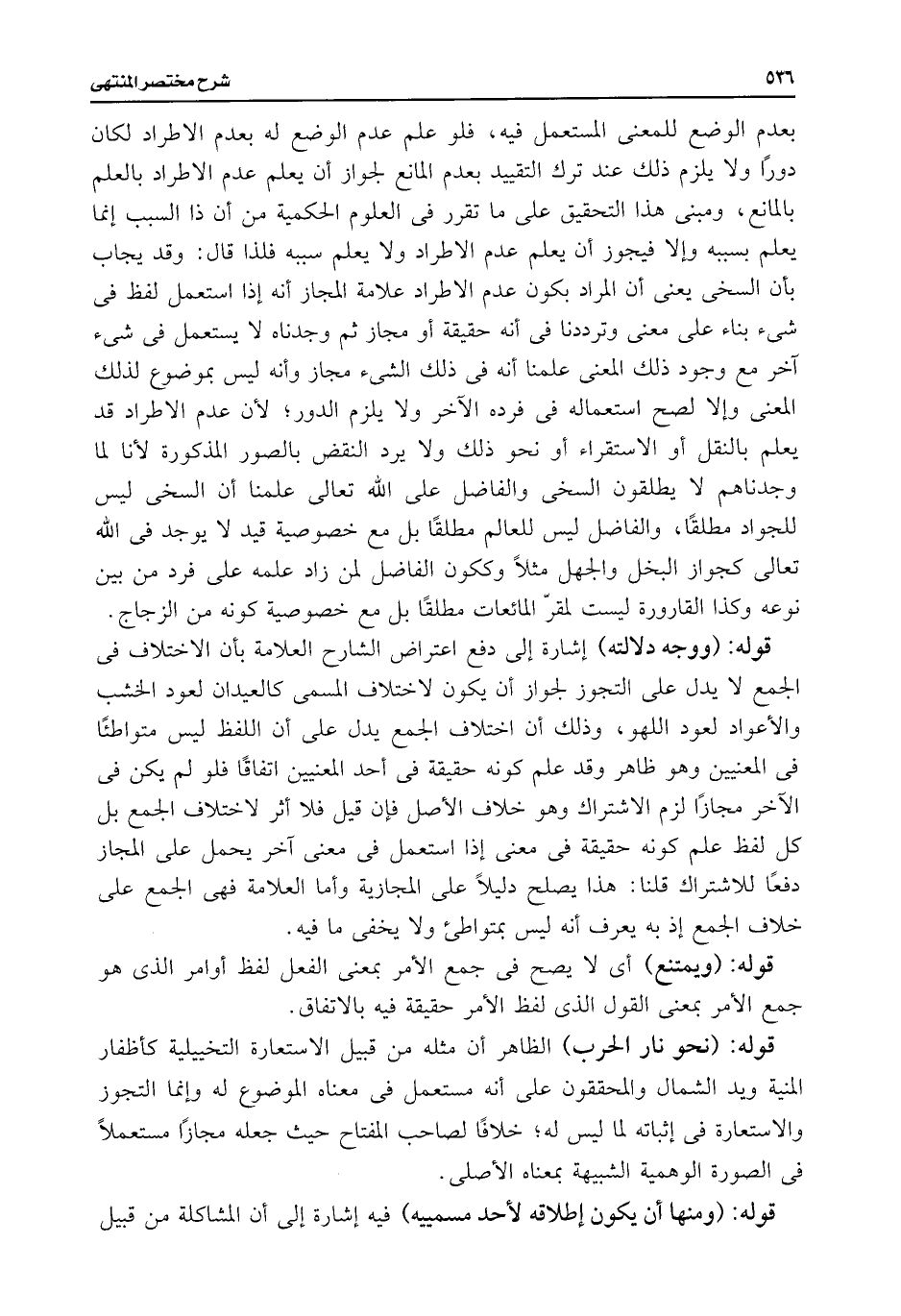 بعدم الوضع للمعنى المستعمل فيه، فلو علم عدم الوضع له بعدم الاطراد لكان دورًا ولا يلزم ذلك عند ترك التقييد بعدم المانع لجواز أن يعلم عدم الاطراد بالعلم بالمانع، ومبنى هذا التحقيق على ما تقرر فى العلوم الحكمية من أن ذا السبب إنما يعلم بسببه وإلا فيجوز أن يعلم عدم الاطراد ولا يعلم سببه فلذا قال: وقد يجاب بأن السخى يعنى أن المراد يكون عدم الاطراد علامة المجاز أنه إذا استعمل لفظ فى شئ بناء على معنى وترددنا فى أنه حقيقة أو مجاز ثم وجدناه لا يستعمل فى شئ آخر مع وجود ذلك المعنى علمنا أنه فى ذلك الشئ مجاز وأنه ليس بموضوع لذلك المعنى وإلا لصح استعماله فى فرده الآخر ولا يلزم الدور؛ لأن عدم الاطراد قد يعلم بالنقل أو الاستقراء أو نحو ذلك ولا يرد النقض بالصور المذكورة لأنا لما وجدناهم لا يطلقون السخى والفاضل على اللَّه تعالى علمنا أن السخى ليس للجواد مطلقًا، والفاضل ليس للعالم مطلقًا بل مع خصوصية قيد لا يوجد فى اللَّه تعالى كجواز البخل والجهل مثلًا وككون الفاضل لمن زاد علمه على فرد من بين نوعه وكذا القارورة ليست لمقرّ المائعات مطلقًا بل مع خصوصية كونه من الزجاج.