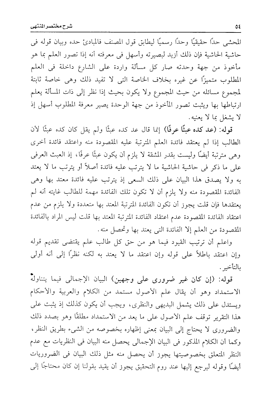 المحشى حدًا حقيقيًا وحدًا رسميًا ليطابق قول المصنف فالمبادئ حده وبيان قوله فى حاشية الحاشية فإن ذلك أزيد لبصيرته وأسهل فى معرفته أنه إذا تصور العلم بما هو مأخوذ من جهة وحدته صار كل مسألة واردة على الشارع داخلة فى العلم المطلوب متميزًا عن غيره بخلاف الخاصة التى لا تفيد ذلك وهى خاصة ثابتة لمجموع مسائله من حيث المجموع ولا يكون بحيث إذا نظر إلى ذات المسألة يعلم ارتباطها بها ويثبت تصور المأخوذ من جهة الوحدة يصير معرفة المطلوب أسهل إذ لا يشغل بما لا يعنيه.