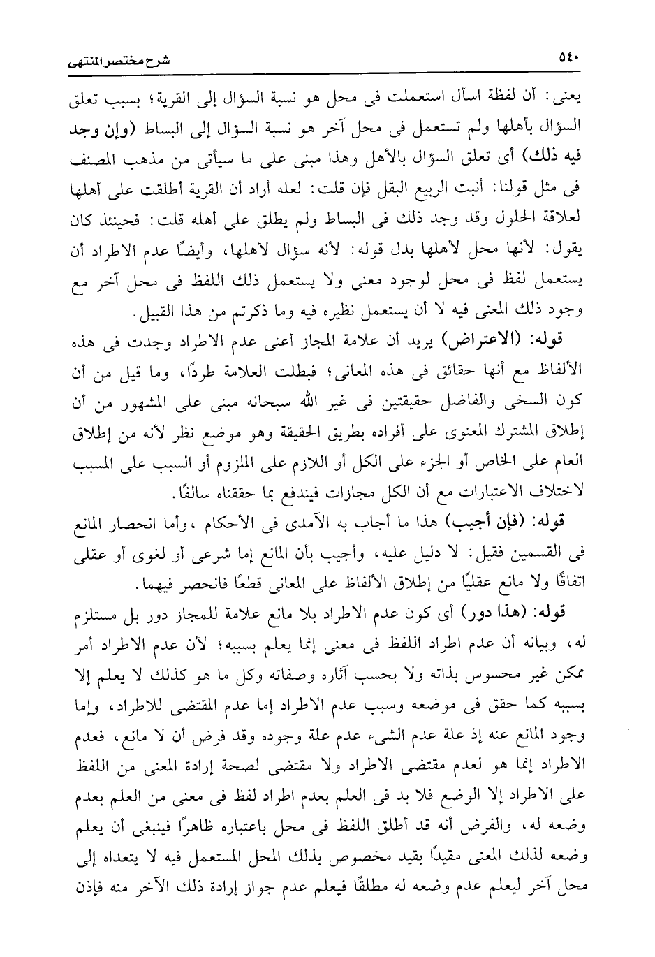قوله: (هذا دور) أى كون عدم الاطراد بلا مانع علامة للمجاز دور بل مستلزم له، وبيانه أن عدم اطراد اللفظ فى معنى إنما يعلم بسببه؛ لأن عدم الاطراد أمر ممكن غير محسوس بذاته ولا بحسب آثاره وصفاته وكل ما هو كذلك لا يعلم إلا بسببه كما حقق فى موضعه وسبب عدم الاطراد إما عدم المقتضى للاطراد، وإما وجود المانع عنه إذ علة عدم الشئ عدم علة وجوده وقد فرض أن لا مانع، فعدم الاطراد إنما هو لعدم مقتضى الاطراد ولا مقتضى لصحة إرادة المعنى من اللفظ على الاطراد إلا الوضع فلا بد فى العلم بعدم اطراد لفظ فى معنى من العلم بعدم وضعه له، والفرض أنه قد أطلق اللفظ فى محل باعتباره ظاهرًا فينبغى أن يعلم وضعه لذلك المعنى مقيدًا بقيد مخصوص بذلك المحل المستعمل فيه لا يتعداه إلى محل آخر ليعلم عدم وضعه له مطلقًا فيعلم عدم جواز إرادة ذلك الآخر منه فإذن