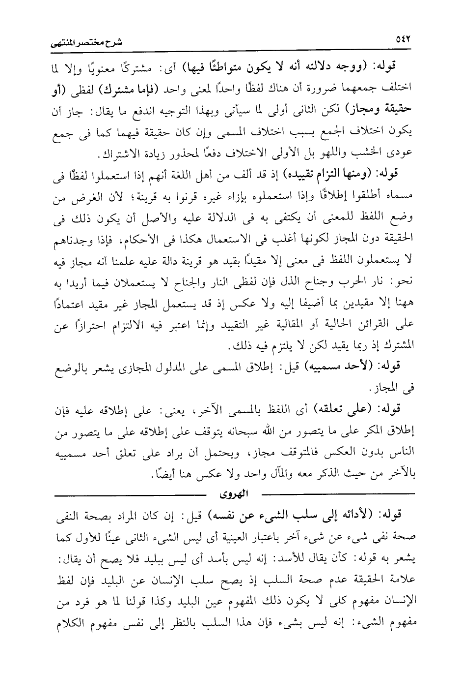 قوله: (لأدائه إلى سلب الشئ عن نفسه) قيل: إن كان المراد بصحة النفى صحة نفى شئ عن شئ آخر باعتبار العينية أى ليس الشئ الثانى عينًا للأول كما يشعر به قوله: كأن يقال للأسد: إنه ليس بأسد أى ليس ببليد فلا يصح أن يقال: علامة الحقيقة عدم صحة السلب إذ يصح سلب الإنسان عن البليد فإن لفظ الإنسان مفهوم كلى لا يكون ذلك المفهوم عين البليد وكذا قولنا لما هو فرد من مفهوم الشئ: إنه ليس بشئ فإن هذا السلب بالنظر إلى نفس مفهوم الكلام