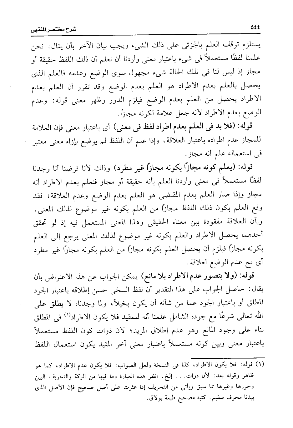 يستلزم توقف العلم بالجزئى على ذلك الشئ ويجب بيان الآخر بأن يقال: نحن علمنا لفظًا مستعملًا فى شئ باعتبار معنى وأردنا أن نعلم أن ذلك اللفظ حقيقة أو مجاز إذ ليس لنا فى تلك الحالة شئ مجهول سوى الوضع وعدمه فالعلم الذى يحصل بالعلم بعدم الاطراد هو العلم بعدم الوضع وقد تقرر أن العلم بعدم الاطراد يحصل من العلم بعدم الوضع فيلزم الدور وظهر معنى قوله: وعدم الوضع بعدم الاطراد لأنه جعل علامة لكونه مجازًا.