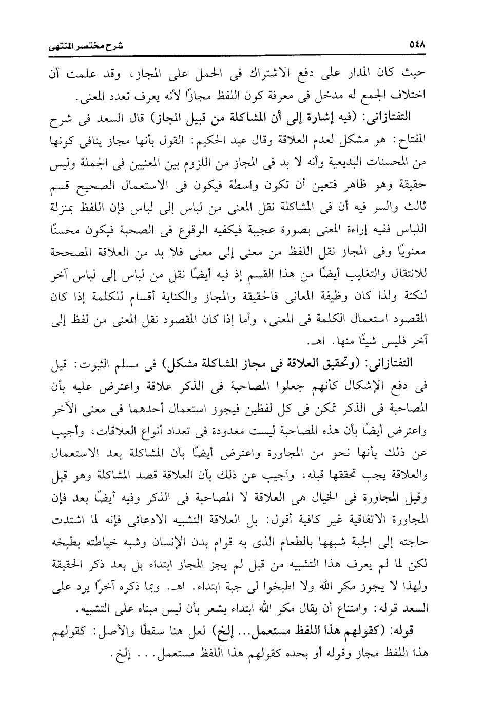 التفتازانى: (وتحقيق العلاقة فى مجاز المشاكلة مشكل) فى مسلم الثبوت: قيل فى دفع الإشكال كأنهم جعلوا المصاحبة فى الذكر علاقة واعترض عليه بأن المصاحبة فى الذكر تمكن فى كل لفظين فيجوز استعمال أحدهما فى معنى الآخر واعترض أيضًا بأن هذه المصاحبة ليست معدودة فى تعداد أنواع العلاقات، وأجيب عن ذلك بأنها نحو من المجاورة واعترض أيضًا بأن المشاكلة بعد الاستعمال والعلاقة يجب تحققها قبله، وأجيب عن ذلك بأن العلاقة قصد المشاكلة وهو قبل وقيل المجاورة فى الخيال هى العلاقة لا المصاحبة فى الذكر وفيه أيضًا بعد فإن المجاورة الاتفاقية غير كافية أقول: بل العلاقة التشبيه الادعائى فإنه لما اشتدت حاجته إلى الجبة شبهها بالطعام الذى به قوام بدن الإنسان وشبه خياطته بطبخه لكن لما لم يعرف هذا التشبيه من قبل لم يجز المجاز ابتداء بل بعد ذكر الحقيقة ولهذا لا يجوز مكر اللَّه ولا اطبخوا لى جبة ابتداء. اهـ. وبما ذكره آخرًا يرد على السعد قوله: وامتناع أن يقال مكر اللَّه ابتداء يشعر بأن ليس مبناه على التشبيه.