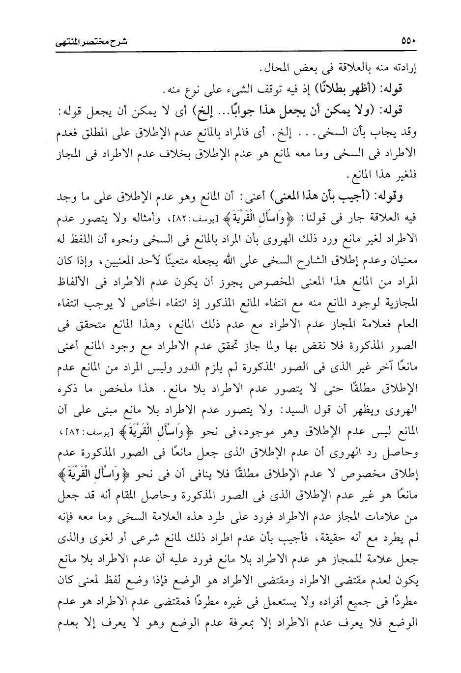 وقوله: (أجيب بأن هذا المعنى) أعنى: أن المانع وهو عدم الإطلاق على ما وجد فيه العلاقة جار فى قولنا: {وَاسْأَلِ الْقَرْيَةَ} [يوسف: ٨٢]، وأمثاله ولا يتصور عدم الاطراد لغير مانع ورد ذلك الهروى بأن المراد بالمانع فى السخى ونحوه أن اللفظ له معنيان وعدم إطلاق الشارح السخى على اللَّه يجعله متعينًا لأحد المعنيين، وإذا كان المراد من المانع هذا المعنى المخصوص يجوز أن يكون عدم الاطراد فى الألفاظ المجازية لوجود المانع منه مع انتفاء المانع المذكور إذ انتفاء الخاص لا يوجب انتفاء العام فعلامة المجاز عدم الاطراد مع عدم ذلك المانع، وهذا المانع متحقق فى الصور المذكورة فلا نقض بها ولما جاز تحقق عدم الاطراد مع وجود المانع أعنى مانعًا آخر غير الذى فى الصور المذكورة لم يلزم الدور وليس المراد من المانع عدم الإطلاق مطلقًا حتى لا يتصور عدم الاطراد بلا مانع. هذا ملخص ما ذكره الهروى ويظهر أن قول السيد: ولا يتصور عدم الاطراد بلا مانع مبنى على أن المانع ليس عدم الإطلاق وهو موجود، فى نحو {وَاسْأَلِ الْقَرْيَةَ} [يوسف: ٨٢]، وحاصل رد الهروى أن عدم الإطلاق الذى جعل مانعًا فى الصور المذكورة عدم إطلاق مخصوص لا عدم الإطلاق مطلقًا فلا ينافى أن فى نحو {وَاسْأَلِ الْقَرْيَةَ} مانعًا هو غير عدم الإطلاق الذى فى الصور المذكورة وحاصل المقام أنه قد جعل من علامات المجاز عدم الاطراد فورد على طرد هذه العلامة السخى وما معه فإنه لم يطرد مع أنه حقيقة، فأجيب بأن عدم اطراد ذلك لمانع شرعى أو لغوى والذى جعل علامة للمجاز هو عدم الاطراد بلا مانع فورد عليه أن عدم الاطراد بلا مانع يكون لعدم مقتضى الاطراد ومقتضى الاطراد هو الوضع فإذا وضع لفظ لمعنى كان مطردًا فى جميع أفراده ولا يستعمل فى غيره مطردًا فمقتضى عدم الاطراد هو عدم الوضع فلا يعرف عدم الاطراد إلا بمعرفة عدم الوضع وهو لا يعرف إلا بعدم