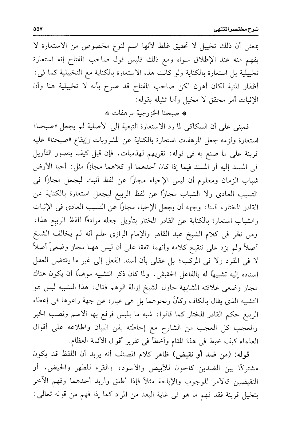 فمبنى على أن السكاكى لما رد الاستعارة التبعية إلى الأصلية لم يجعل "صبحنا" استعارة ولزمه جعل المرهفات استعارة بالكناية عن المشروبات وإيقاع "صبحنا" عليه قرينة على ما صنع به فى قوله: نقريهم لهذميات، فإن قيل كيف يتصور التأويل فى المسند إليه أو المسند فيما إذا كان أحدهما أو كلاهما مجازًا مثل: أحيا الأرض شباب الزمان ومعلوم أن ليس الإحياء مجازًا عن لفظ أنبت ليجعل مجازًا فى التسبب العادى ولا الشباب مجازًا عن لفظ الربيع ليجعل استعارة بالكناية عن القادر المختار، قلنا: وجهه أن يجعل الإحياء مجازًا عن التسبب العادى فى الإنبات والشباب استعارة بالكناية عن القادر المختار بتأويل جعله مرادفًا للفظ الربيع هذا، ومن نظر فى كلام الشيخ عبد القاهر والإمام الرازى علم أنه لم يخالف الشيخ أصلًا ولم يزد على تنقيح كلامه وأنهما اتفقا على أن ليس ههنا مجاز وضعى أصلًا لا فى المفرد ولا فى المركب؛ بل عقلى بأن أسند الفعل إلى غير ما يقتضى العقل إسناده إليه تشبيهًا له بالفاعل الحقيقى، ولما كان ذكر التشبيه موهمًا أن يكون هناك مجاز وضعى علاقته المشابهة حاول الشيخ إزالة الوهم فقال: هذا التشبيه ليس هو التشبيه الذى يقال بالكاف وكأنّ ونحوهما بل هى عبارة عن جهة راعوها فى إعطاء الربيع حكم القادر المختار كما قالوا: شبه ما بليس فرفع بها الاسم ونصب الخبر والعجب كل العجب من الشارح مع إحاطته بفن البيان واطلاعه على أقوال العلماء كيف خبط فى هذا المقام وأخطأ فى تقرير أقوال الأئمة العظام.