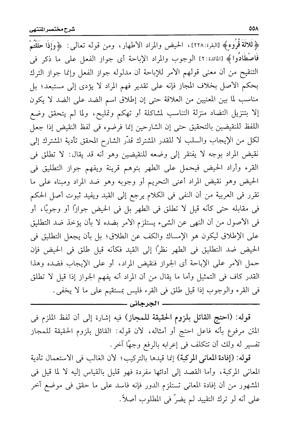 {ثَلَاثَةَ قُرُوءٍ} [البقرة: ٢٢٨]، الحيض والمراد الأطهار، ومن قوله تعالى: {وَإِذَا حَلَلْتُمْ فَاصْطَادُوا} [المائدة: ٢] الوجوب والمراد الإباحة أى جواز الفعل على ما ذكر فى التنقيح من أن معنى قولهم الأمر للإباحة أن مدلوله جواز الفعل وإنما جواز الترك بحكم الأصل بخلاف المجاز فإنه على تقدير فهم المراد لا يؤدى إلى مستبعد؛ بل مناسب لما بين المعنيين من العلاقة حتى إن إطلاق اسم الضد على الضد لا يكون إلا بتنزيل التضاد منزلة التناسب لمشاكلة أو تهكم وتمليح، ولما لم يتحقق وضع اللفظ للنقيضين بالتحقيق حتى إن الشارحين إنما فرضوه فى لفظ النقيض إذا جعل لكل من الإيجاب والسلب لا للقدر المشترك قدّر الشارح المحقق تأدية المشترك إلى نقيض المراد بوجه لا يفتقر إلى وضعه للنقيضين وهو أنه قد يقال: لا تطلق فى القرء وأراد الحيض فيحمل على الطهر بتوهم قرينة ويفهم جواز التطليق فى الحيض وهو نقيض المراد أعنى التحريم أو وجوبه وهو ضد المراد ومبناه على ما تقرر فى العربية من أن النفى فى الكلام يرجع إلى القيد ويفيد ثبوت أصل الحكم فى مقابله حتى كأنه قيل لا تطلق فى الطهر بل فى الحيض جوازًا أو وجوبًا، أو فى الأصول من أن النهى عن الشئ يستلزم الأمر بضده لا بأن يؤخذ ضد التطليق على الإطلاق ليكون هو الإمساك والكف عن الطلاق؛ بل بأن يجعل التطليق فى الحيض ضد التطليق فى الطهر نظرًا إلى القيد فكأنه قيل طلق فى الحيض فإن حمل الأمر على الإباحة أى الجواز فنقيض المراد، أو على الإيجاب فضده وهذا القدر كاف فى التمثيل وأما ما يقال من أن المراد أنه يفهم الجواز إذا قيل لا تطلق فى القرء والوجوب إذا قيل طلق فى القرء فليس بمستقيم على ما لا يخفى.