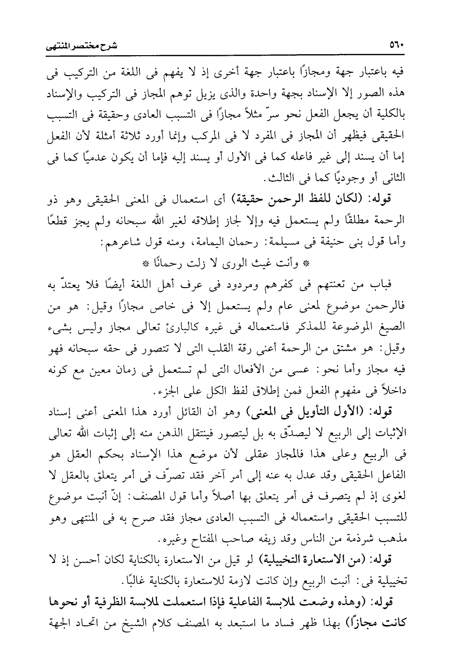 فيه باعتبار جهة ومجازًا باعتبار جهة أخرى إذ لا يفهم فى اللغة من التركيب فى هذه الصور إلا الإسناد بجهة واحدة والذى يزيل توهم المجاز فى التركيب والإسناد بالكلية أن يجعل الفعل نحو سرّ مثلًا مجازًا فى التسبب العادى وحقيقة فى التسبب الحقيقى فيظهر أن المجاز فى المفرد لا فى المركب وإنما أورد ثلاثة أمثلة لأن الفعل إما أن يسند إلى غير فاعله كما فى الأول أو يسند إليه فإما أن يكون عدميًا كما فى الثانى أو وجوديًا كما فى الثالث.