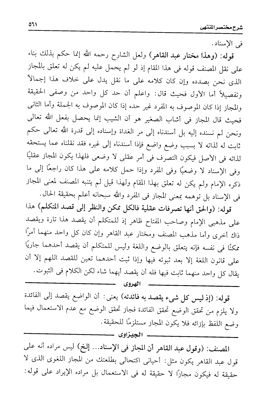 قوله: (وهذا مختار عبد القاهر) ولعل الشارح رحمه اللَّه إنما حكم بذلك بناء على نقل المصنف قوله فى هذا المقام إذ لو لم يحمل عليه لم يكن له تعلق بالمجاز الذى نحن بصدده وإن كان كلامه على ما نقل يدل على خلاف هذا إجمالًا وتفصيلًا أما الأول فحيث قال: واعلم أن حد كل واحد من وصفى الحقيقة والمجاز إذا كان الموصوف به المفرد غير حده إذا كان الموصوف به الجملة وأما الثانى فحيث قال المجاز فى أشاب الصغير هو أن الشيب إنما يحصل بفعل اللَّه تعالى ونحن لم نسنده إليه بل أسندناه إلى مر الغداة وإسناده إلى قدرة اللَّه تعالى حكم ثابت له لذاته لا بسبب وضع واضع فإذا أسندناه إلى غيره فقد نقلناه عما يستحقه لذاته فى الأصل فيكون التصرف فى أمر عقلى لا وضعى فلهذا يكون المجاز عقليًا وفى الإسناد لا وضعيًا وفى المفرد وإذا حمل كلامه على هذا كان راجعًا إلى ما ذكره الإمام ولم يكن له تعلق بهذا المقام ولهذا قيل لم يتنبه المصنف لمعنى المجاز فى الإسناد بل توهمه بمعنى المجاز فى المفرد واللَّه سبحانه أعلم بحقيقة الحال.