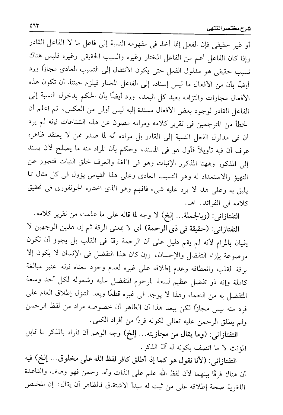التفتازانى: (حقيقة فى ذى الرحمة) أى لا بمعنى الرقة ثم إن هذين الوجهين لا يفيان بالرام لأنه لم يقم دليل على أن الرحمة رقة فى القلب بل يجوز أن تكون موضوعة بإزاء التفضل والإحسان، وإن كان هذا التفضل فى الإنسان لا يكون إلا برقة القلب وانعطافه وعدم إطلاقه على غيره لعدم وجود معناه فإنه اعتبر مبالغة كاملة وإنه ذو تفضل عظيم لسعة المرحوم المتفضل عليه وشموله لكل أحد وسعة المتفضل به من النعماء وهذا لا يوجد فى غيره قطعًا وبعد التنزل إطلاق العام على فرد منه ليس مجازًا لكن يبعد هذا أن الظاهر أن خصوصه مراد من لفظ الرحمن ولم يطلق الرحمن عليه تعالى لكونه فردًا من أفراد الكلى.