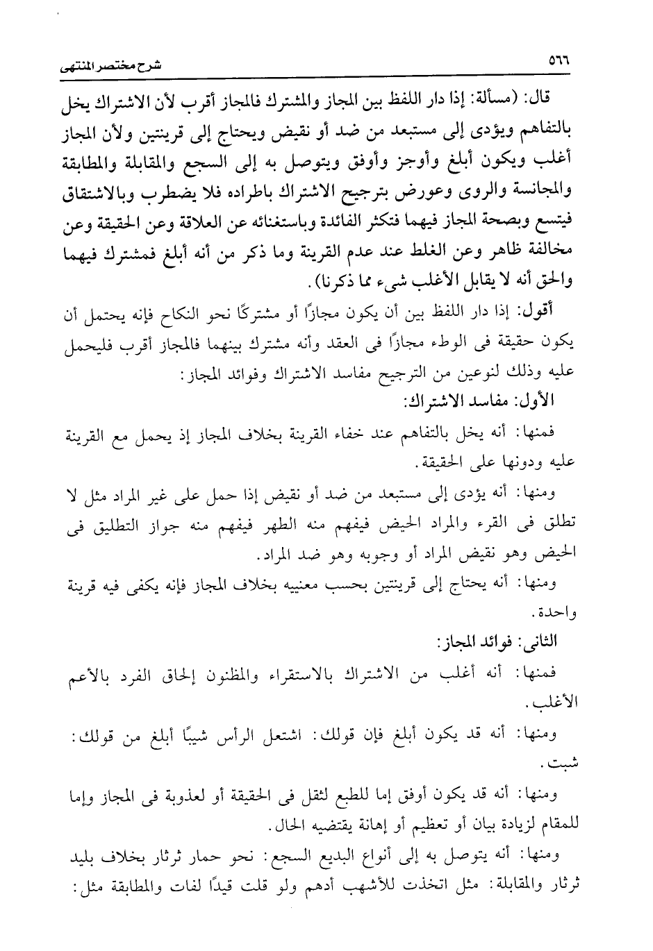 قال: (مسألة: إذا دار اللفظ بين المجاز والمشترك فالمجاز أقرب لأن الاشتراك يخل بالتفاهم ويؤدى إلى مستبعد من ضد أو نقيض ويحتاج إلى قرينتين ولأن المجاز أغلب ويكون أبلغ وأوجز وأوفق ويتوصل به إلى السجع والمقابلة والمطابقة والمجانسة والروى وعورض بترجيح الاشتراك باطراده فلا يضطرب وبالاشتقاق فيتسع وبصحة المجاز فيهما فتكثر الفائدة وباستغنائه عن العلاقة وعن الحقيقة وعن مخالفة ظاهر وعن الغلط عند عدم القرينة وما ذكر من أنه أبلغ فمشترك فيهما والحق أنه لايقابل الأغلب شئ مما ذكانا).