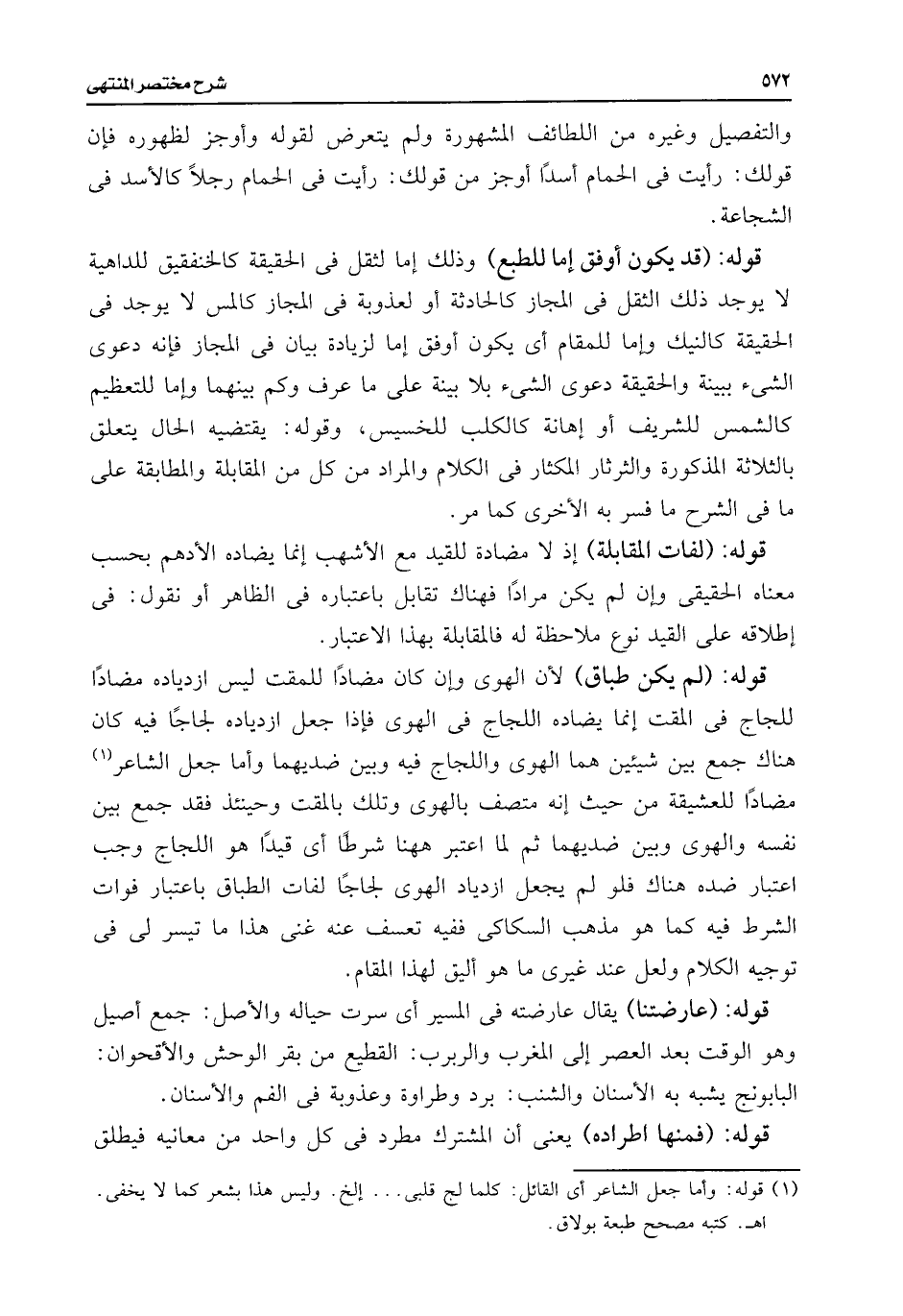 قوله: (لم يكن طباق) لأن الهوى وإن كان مضادًا للمقت ليس ازدياده مضادًا للجاج فى المقت إنما يضاده اللجاج فى الهوى فإذا جعل ازدياده لجاجًا فيه كان هناك جمع بين شيئين هما الهوى واللجاج فيه وبين ضديهما وأما جعل الشاعر (¬١) مضادًا للعشيقة من حيث إنه متصف بالهوى وتلك بالمقت وحينئذ فقد جمع بين نفسه والهوى وبين ضديهما ثم لما اعتبر ههنا شرطًا أى قيدًا هو اللجاج وجب اعتبار ضده هناك فلو لم يجعل ازدياد الهوى لجاجًا لفات الطباق باعتبار فوات الشرط فيه كما هو مذهب السكاكى ففيه تعسف عنه غنى هذا ما تيسر لى فى توجيه الكلام ولعل عند غيرى ما هو أليق لهذا المقام.