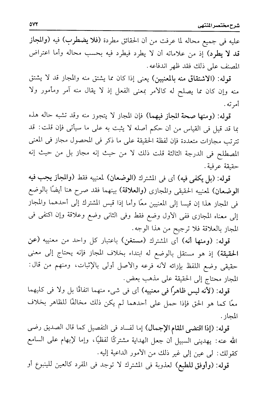 قوله: (ومنها صحة المجاز فيهما) فإن المجاز لا يتجوز منه وقد تشبه حاله هذه بما قد قيل فى القياس من أن حكم أصله لا يثبت به على ما سيأتى فإن قلت: قد تترتب مجازات متعددة فإن لفظة الحقيقة على ما ذكر فى المحصول مجاز فى المعنى المصطلح فى الدرجة الثالثة قلت ذلك لا من حيث إنه مجاز بل من حيث إنه حقيقة عرفية.