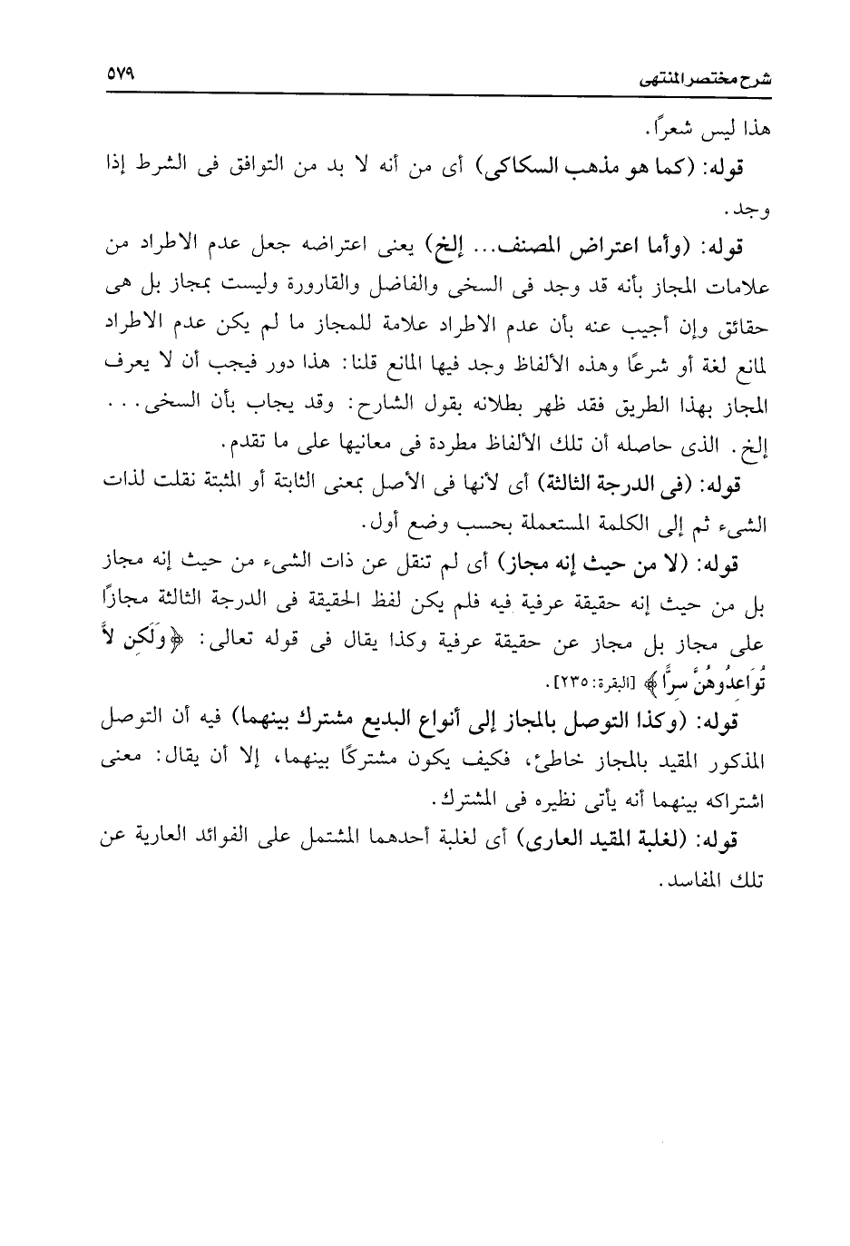 قوله: (وأما اعتراض المصنف. . . إلخ) يعنى اعتراضه جعل عدم الاطراد من علامات المجاز بأنه قد وجد فى السخى والفاضل والقارورة وليست بمجاز بل هى حقائق وإن أجيب عنه بأن عدم الاطراد علامة للمجاز ما لم يكن عدم الاطراد لمانع لغة أو شرعًا وهذه الألفاظ وجد فيها المانع قلنا: هذا دور فيجب أن لا يعرف المجاز بهذا الطريق فقد ظهر بطلانه بقول الشارح: وقد يجاب بأن السخى. . . إلخ. الذى حاصله أن تلك الألفاظ مطردة فى معانيها على ما تقدم.