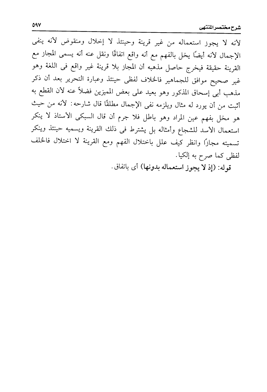 لأنه لا يجوز استعماله من غير قرينة وحينئذ لا إخلال ومنقوض لأنه ينفى الإجمال لأنه أيضًا يخل بالفهم مع أنه واقع اتفاقًا ونقل عنه أنه يسمى المجاز مع القرينة حقيقة فيخرج حاصل مذهبه أن المجاز بلا قرينة غير واقع فى اللغة وهو غير صحيح موافق للجماهير فالخلاف لفظى حينئذ وعبارة التحرير بعد أن ذكر مذهب أبى إسحاق المذكور وهو بعيد على بعض المميزين فضلًا عنه لأن القطع به أثبت من أن يورد له مثال ويلزمه نفى الإجمال مطلقًا قال شارحه: لأنه من حيث هو مخل بفهم عين المراد وهو باطل فلا جرم أن قال السبكى الأستاذ لا ينكر استعمال الأسد للشجاع وأمثاله بل يشترط فى ذلك القرينة ويسميه حينئذ وينكر تسميته مجازًا وانظر كيف علل باختلال الفهم ومع القرينة لا اختلال فالخلف لفظى كما صرح به إلكيا.