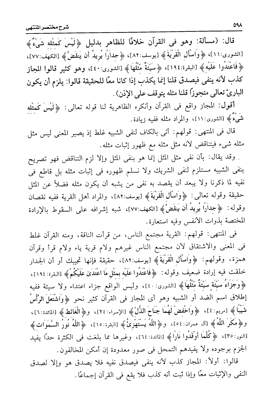 فى المنتهى: قولهم: القرية مجتمع الناس، من قرأت الناقة، ومنه القرآن غلط فى المعنى والاشتقاق لأن مجتمع الناس غيرهم ولام قرية ياء ولام قرأ وقرآن همزة، وقولهم: {وَاسْأَلِ الْقَرْيَةَ} [يوسف: ٨٢]، حقيقة فإنها تجيبك أو أن الجدار خلقت فيه إرادة ضعيف وقوله: {فَاعْتَدُوا عَلَيْهِ بِمِثْلِ مَا اعْتَدَى عَلَيْكُمْ} [البقرة: ١٩٤]، {وَجَزَاءُ سَيِّئَةٍ سَيِّئَةٌ مِثْلُهَا} [الشورى: ٤٠]، وليس الواقع جزاء اعتداء ولا سيئة ففيه إطلاق اسم الضد أو الشبيه وهو أى المجاز فى القرآن كثير نحو {وَاشْتَعَلَ الرَّأْسُ شَيْبًا} [مريم: ٤]، {وَاخْفِضْ لَهُمَا جَنَاحَ الذُّلِّ} [الإسراء: ٢٤]، و {الْغَائِطِ} [المائدة: ٦]، و {وَمَكَرَ اللَّهُ} [آل عمران: ٥٤]، و {اللَّهُ يَسْتَهْزِئُ} [البقرة: ١٥]، {اللَّهُ نُورُ السَّمَاوَاتِ} [النور: ٣٥]، {كُلَّمَا أَوْقَدُوا نَارًا} [المائدة: ٦٤]، وغيرها مما بلغت فى الكثرة حدًا يفيد الجزم بوجوده ولا يفيدهم التمحل فى صور معدودة إن أمكن المخالفون.