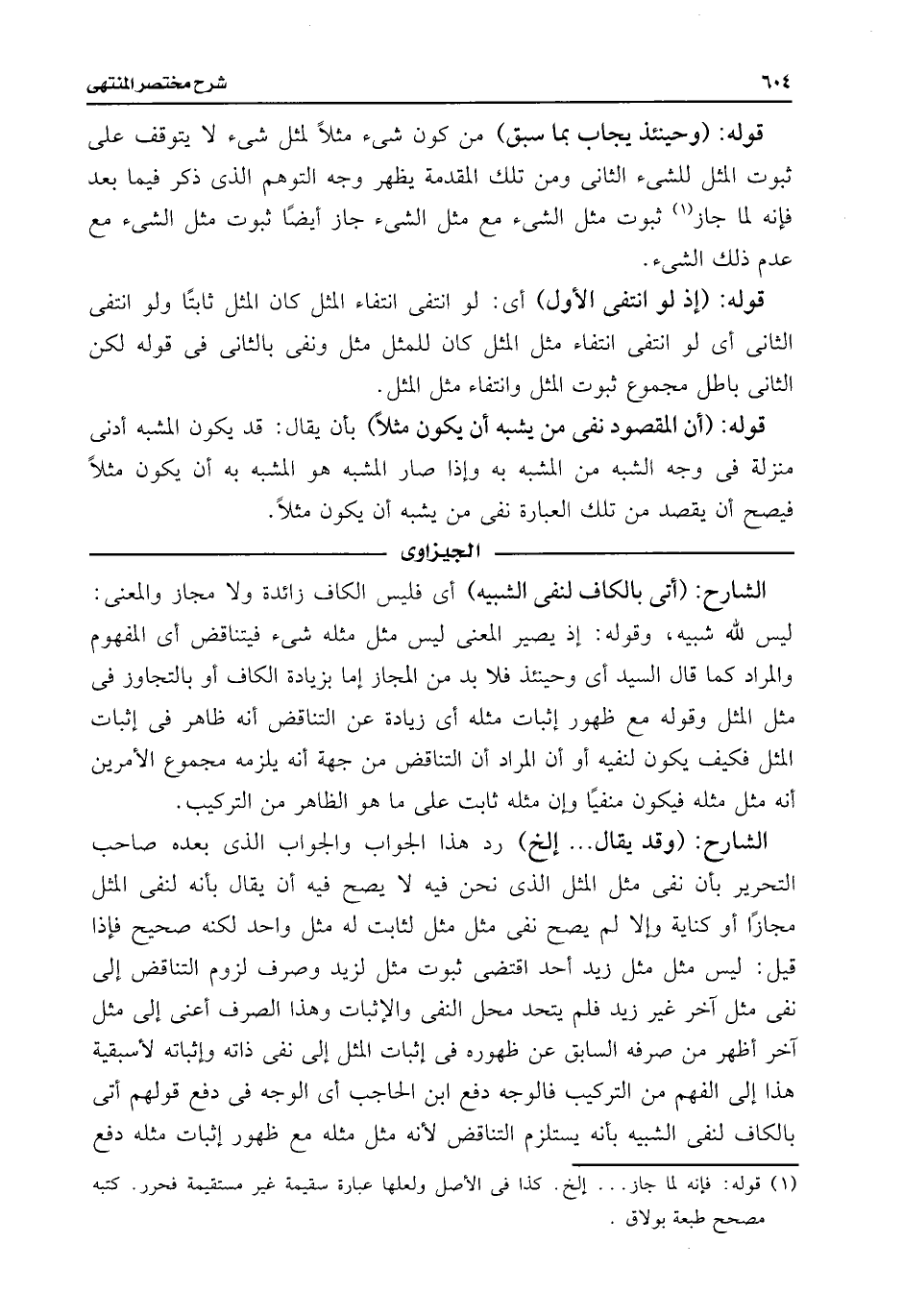 الشارح: (أتى بالكاف لنفى الشبيه) أى فليس الكاف زائدة ولا مجاز والمعنى: ليس للَّه شبيه، وقوله: إذ يصير المعنى ليس مثل مثله شئ فيتناقض أى المفهوم والمراد كما قال السيد أى وحينئذ فلا بد من المجاز إما بزيادة الكاف أو بالتجاوز فى مثل المثل وقوله مع ظهور إثبات مثله أى زيادة عن التناقض أنه ظاهر فى إثبات المثل فكيف يكون لنفيه أو أن المراد أن التناقض من جهة أنه يلزمه مجموع الأمرين أنه مثل مثله فيكون منفيًا وإن مثله ثابت على ما هو الظاهر من التركيب.