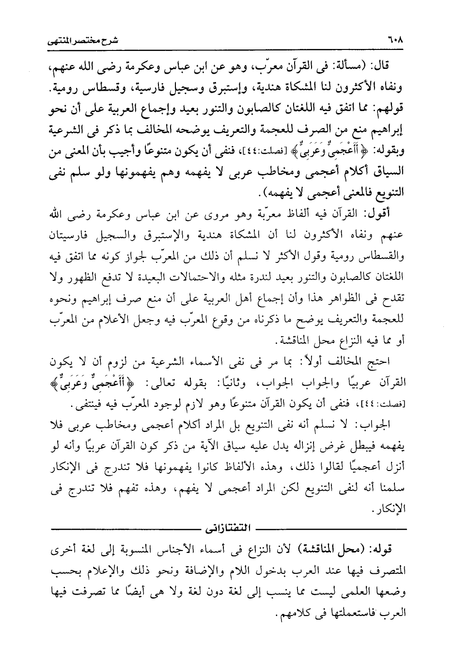 قال: (مسألة: فى القرآن معرّب، وهو عن ابن عباس وعكرمة رضى اللَّه عنهم، ونفاه الأكثرون لنا المشكاة هندية، وإستبرق وسجيل فارسية، وقسطاس رومية. قولهم: مما اتفق فيه اللغتان كالصابون والتنور بعيد وإجماع العربية على أن نحو إبراهيم منع من الصرف للعجمة والتعريف يوضحه المخالف بما ذكر فى الشرعية وبقوله: {أَأَعْجَمِيٌّ وَعَرَبِيٌّ} [فصلت: ٤٤]، فنفى أن يكون متنوعًا وأجيب بأن المعنى من السياق أكلام أعجمى ومخاطب عربى لا يفهمه وهم يفهمونها ولو سلم نفى التنويع فالمعنى أعجمى لا يفهمه).