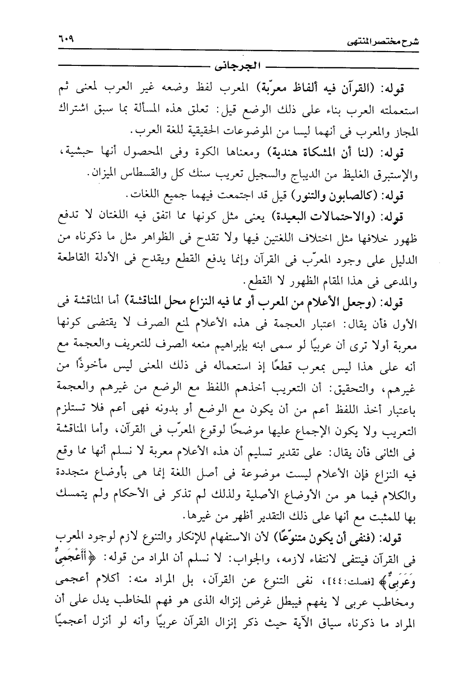 قوله: (القرآن فيه ألفاظ معرّبة) العرب لفظ وضعه غير العرب لمعنى ثم استعملته العرب بناء على ذلك الوضع قيل: تعلق هذه المسألة بما سبق اشتراك المجاز والمعرب فى أنهما ليسا من الموضوعات الحقيقية للغة العرب.