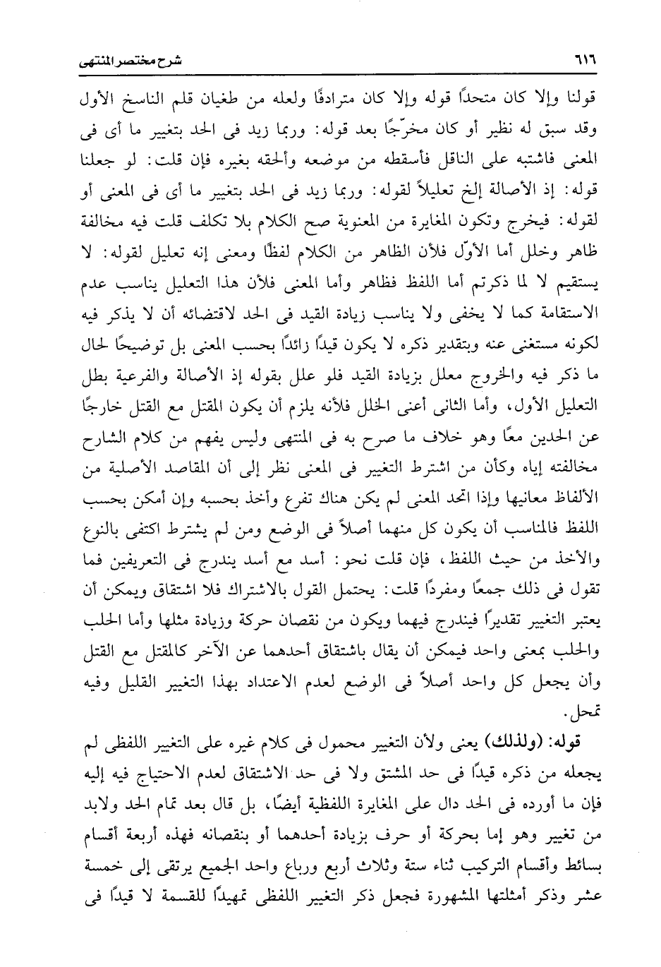 قولنا وإلا كان متحدًا قوله وإلا كان مترادفًا ولعله من طغيان قلم الناسخ الأول وقد سبق له نظير أو كان مخرّجًا بعد قوله: وربما زيد فى الحد بتغيير ما أى فى المعنى فاشتبه على الناقل فأسقطه من موضعه وألحقه بغيره فإن قلت: لو جعلنا قوله: إذ الأصالة إلخ تعليلًا لقوله: وربما زيد فى الحد بتغيير ما أى فى المعنى أو لقوله: فيخرج وتكون المغايرة من المعنوية صح الكلام بلا تكلف قلت فيه مخالفة ظاهر وخلل أما الأوّل فلأن الظاهر من الكلام لفظًا ومعنى إنه تعليل لقوله: لا يستقيم لا لما ذكرتم أما اللفظ فظاهر وأما المعنى فلأن هذا التعليل يناسب عدم الاستقامة كما لا يخفى ولا يناسب زيادة القيد فى الحد لاقتضائه أن لا يذكر فيه لكونه مستغنى عنه وبتقدير ذكره لا يكون قيدًا زائدًا بحسب المعنى بل توضيحًا لحال ما ذكر فيه والخروج معلل بزيادة القيد فلو علل بقوله إذ الأصالة والفرعية بطل التعليل الأول، وأما الثانى أعنى الخلل فلأنه يلزم أن يكون المقتل مع القتل خارجًا عن الحدين معًا وهو خلاف ما صرح به فى المنتهى وليس يفهم من كلام الشارح مخالفته إياه وكأن من اشترط التغيير فى المعنى نظر إلى أن المقاصد الأصلية من الألفاظ معانيها وإذا اتحد المعنى لم يكن هناك تفرع وأخذ بحسبه وإن أمكن بحسب اللفظ فالمناسب أن يكون كل منهما أصلًا فى الوضع ومن لم يشترط اكتفى بالنوع والأخذ من حيث اللفظ، فإن قلت نحو: أسد مع أسد يندرج فى التعريفين فما تقول فى ذلك جمعًا ومفردًا قلت: يحتمل القول بالاشتراك فلا اشتقاق ويمكن أن يعتبر التغيير تقديرًا فيندرج فيهما ويكون من نقصان حركة وزيادة مثلها وأما الحلب والحلب بمعنى واحد فيمكن أن يقال باشتقاف أحدهما عن الآخر كالمقتل مع القتل وأن يجعل كل واحد أصلًا فى الوضع لعدم الاعتداد بهذا التغيير القليل وفيه تمحل.