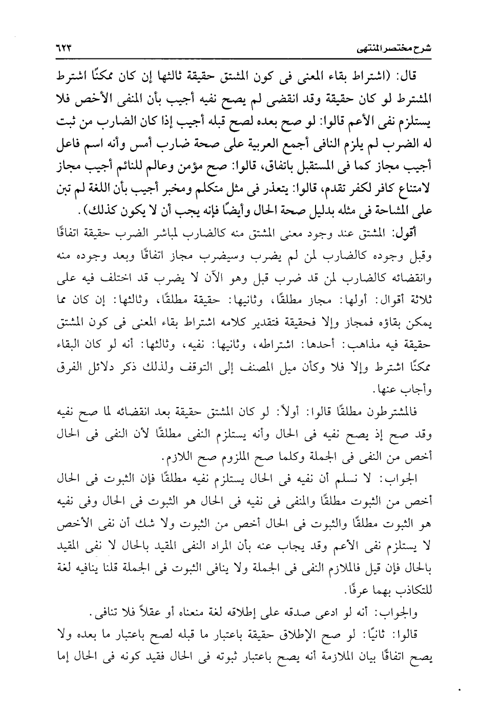 قال: (اشتراط بقاء المعنى فى كون المشتق حقيقة ثالثها إن كان ممكنًا اشترط المشترط لو كان حقيقة وقد انقضى لم يصح نفيه أجيب بأن المنفى الأخص فلا يستلزم نفى الأعم قالوا: لو صح بعده لصح قبله أجيب إذا كان الضارب من ثبت له الضرب لم يلزم النافى أجمع العربية على صحة ضارب أمس وأنه اسم فاعل أجيب مجاز كما فى المستقبل باتفاق، قالوا: صح مؤمن وعالم للنائم أجيب مجاز لامتناع كافر لكفر تقدم، قالوا: يتعذر فى مثل متكلم ومخبر أجيب بأن اللغة لم تبن على المشاحة فى مثله بدليل صحة الحال وأيضًا فإنه يجب أن لا يكون كذلك).