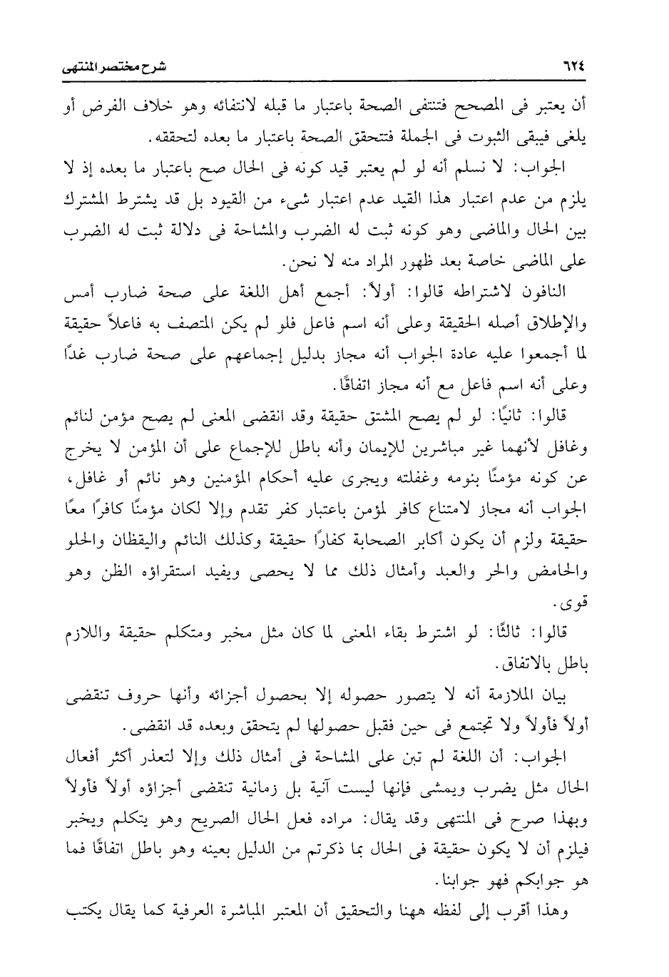 الجواب: أن اللغة لم تبن على المشاحة فى أمثال ذلك وإلا لتعذر أكثر أفعال الحال مثل يضرب ويمشى فإنها ليست آنية بل زمانية تنقضى أجزاؤه أولًا فأولًا وبهذا صرح فى المنتهى وقد يقال: مراده فعل الحال الصريح وهو يتكلم ويخبر فيلزم أن لا يكون حقيقة فى الحال بما ذكرتم من الدليل بعينه وهو باطل اتفاقًا فما هو جوابكم فهو جوابنا.