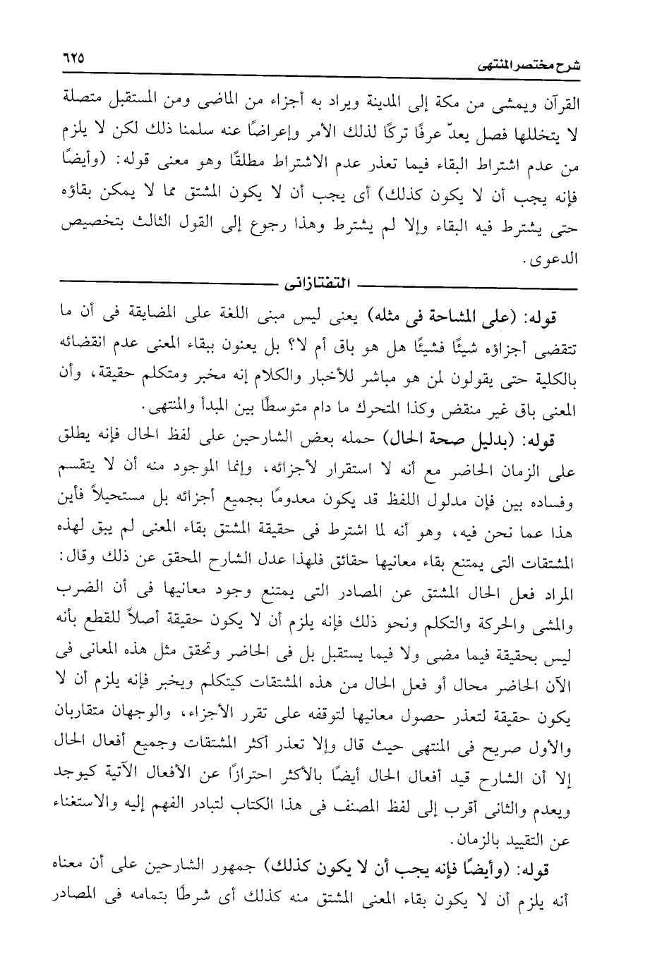 القرآن ويمشى من مكة إلى المدينة ويراد به أجزاء من الماضى ومن المستقبل متصلة لا يتخللها فصل يعدّ عرفًا تركًا لذلك الأمر وإعراضًا عنه سلمنا ذلك لكن لا يلزم من عدم اشتراط البقاء فيما تعذر عدم الاشتراط مطلقًا وهو معنى قوله: (وأيضًا فإنه يجب أن لا يكون كذلك) أى يجبط أن لا يكون المشتق مما لا يمكن بقاؤه حتى يشترط فيه البقاء وإلا لم يشترط وهذا رجوع إلى القول الثالث بتخصيص الدعوى.