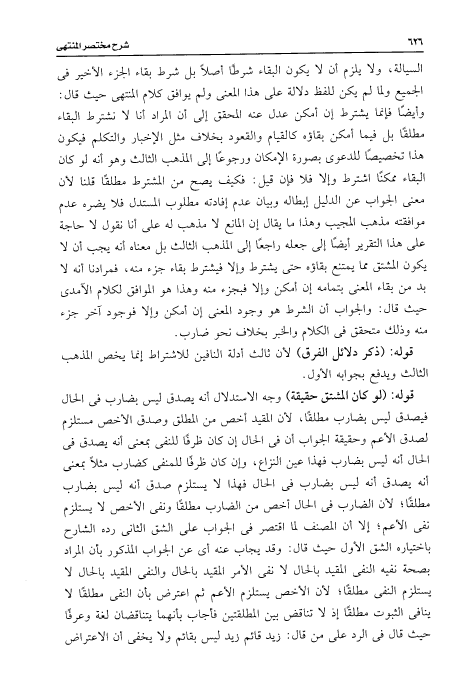 السيالة، ولا يلزم أن لا يكون البقاء شرطًا أصلًا بل شرط بقاء الجزء الأخير فى الجميع ولما لم يكن للفظ دلالة على هذا المعنى ولم يوافق كلام المنتهى حيث قال: وأيضًا فإنما يشترط إن أمكن عدل عنه المحقق إلى أن المراد أنا لا نشترط البقاء مطلقًا بل فيما أمكن بقاؤه كالقيام والقعود بخلاف مثل الإخبار والتكلم فيكون هذا تخصيصًا للدعوى بصورة الإمكان ورجوعًا إلى المذهب الثالث وهو أنه لو كان البقاء ممكنًا اشترط وإلا فلا فإن قيل: فكيف يصح من المشترط مطلقًا قلنا لأن معنى الجواب عن الدليل إبطاله وبيان عدم إفادته مطلوب المستدل فلا يضره عدم موافقته مذهب المجيب وهذا ما يقال إن المانع لا مذهب له على أنا نقول لا حاجة على هذا التقرير أيضًا إلى جعله راجعًا إلى المذهب الثالث بل معناه أنه يجب أن لا يكون المشتق مما يمتنع بقاؤه حتى يشترط وإلا فيشترط بقاء جزء منه، فمرادنا أنه لا بد من بقاء المعنى بتمامه إن أمكن وإلا فبجزء منه وهذا هو الموافق لكلام الآمدى حيث قال: والجواب أن الشرط هو وجود المعنى إن أمكن وإلا فوجود آخر جزء منه وذلك متحقق فى الكلام والخبر بخلاف نحو ضارب.