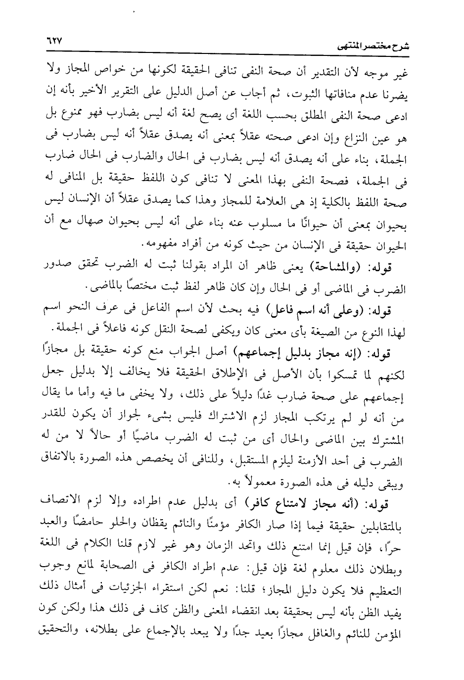 غير موجه لأن التقدير أن صحة النفى تنافى الحقيقة لكونها من خواص المجاز ولا يضرنا عدم منافاتها الثبوت، ثم أجاب عن أصل الدليل على التقرير الأخير بأنه إن ادعى صحة النفى المطلق بحسب اللغة أى يصح لغة أنه ليس بضارب فهو ممنوع بل هو عين النزاع وإن ادعى صحته عقلًا بمعنى أنه يصدق عقلًا أنه ليس بضارب فى الجملة، بناء على أنه يصدق أنه ليس بضارب فى الحال والضارب فى الحال ضارب فى الجملة، فصحة النفى بهذا المعنى لا تنافى كون اللفظ حقيقة بل النافى له صحة اللفظ بالكلية إذ هى العلامة للمجاز وهذا كما يصدق عقلًا أن الإنسان ليس بحيوان بمعنى أن حيوانًا ما مسلوب عنه بناء على أنه ليس بحيوان صهال مع أن الحيوان حقيقة فى الإنسان من حيث كونه من أفراد مفهومه.