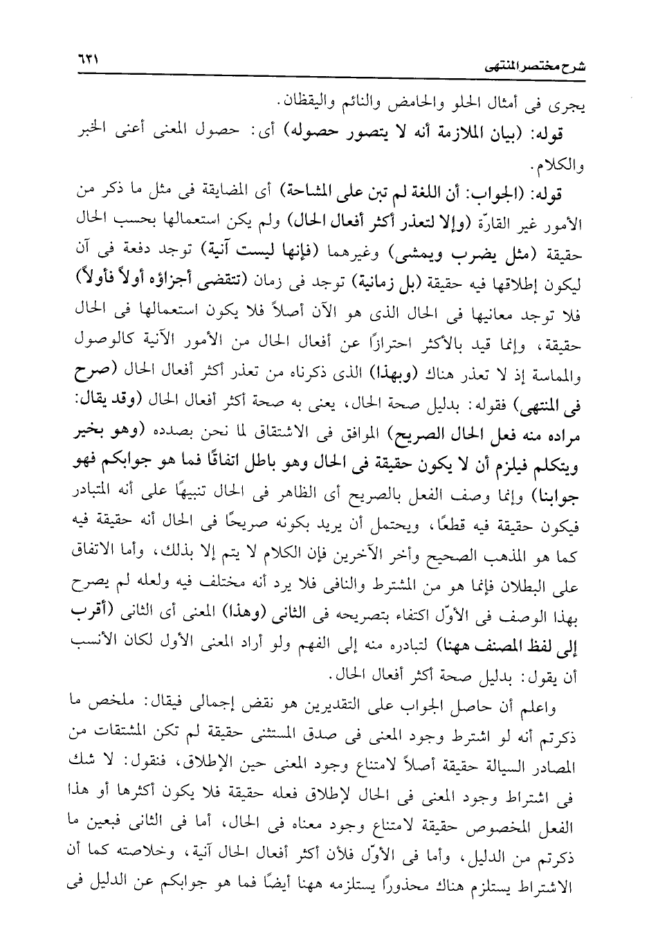 واعلم أن حاصل الجواب على التقديرين هو نقض إجمالى فيقال: ملخص ما ذكرتم أنه لو اشترط وجود المعنى فى صدق المستثنى حقيقة لم تكن المشتقات من المصادر السيالة حقيقة أصلًا لامتناع وجود المعنى حين الإطلاق، فنقول: لا شك فى اشتراط وجود المعنى فى الحال لإطلاق فعله حقيقة فلا يكون أكثرها أو هذا الفعل المخصوص حقيقة لامتناع وجود معناه فى الحال، أما فى الثانى فبعين ما ذكرتم من الدليل، وأما فى الأول فلأن أكثر أفعال الحال آنية، وخلاصته كما أن الاشتراط يستلزم هناك محذورًا يستلزمه ههنا أيضًا فما هو جوابكم عن الدليل فى