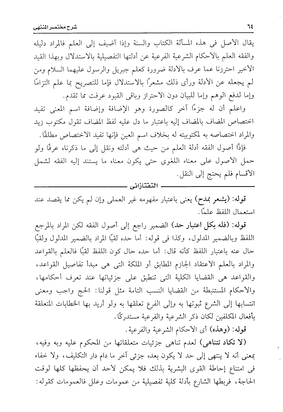 يقال الأصل فى هذه المسألة الكتاب والسنة وإذا أضيف إلى العلم فالمراد دليله والفقه العلم بالأحكام الشرعية الفرعية عن أدلتها التفصيلية بالاستدلال وبهذا القيد الأخير احترزنا عما عرف بالأدلة ضرورة كعلم جبريل والرسول عليهما السلام ومن لم يجعله عن الأدلة ورأى ذلك مشعرًا بالاستدلال فإما للتصريح بما علم التزامًا وإما لدفع الوهم واما للبيان دون الاحتراز وباقى القيود عرفت مما تقدم.