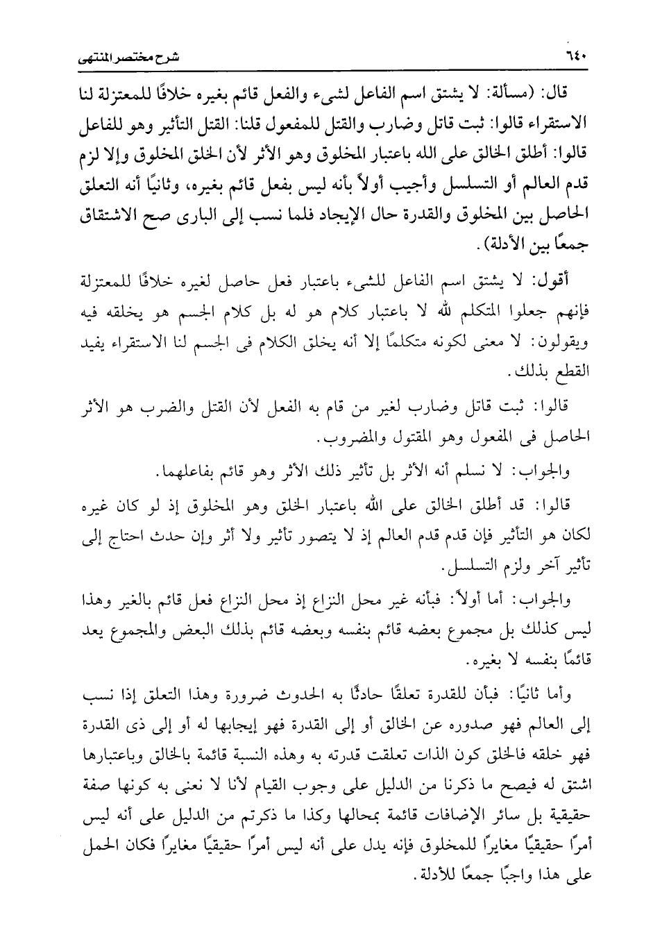 قال: (مسألة: لا يشتق اسم الفاعل لشئ والفعل قائم بغيره خلافًا للمعتزلة لنا الاستقراء قالوا: ثبت قاتل وضارب والقتل للمفعول قلنا: القتل التأثير وهو للفاعل قالوا: أطلق الخالق على اللَّه باعتبار المخلوق وهو الأثر لأن الخلق المخلوق وإلا لزم قدم العالم أو التسلسل وأجيب أولًا بأنه ليس بفعل قائم بغيره، وثانيًا أنه التعلق الحاصل بين المخلوق والقدرة حال الإيجاد فلما نسب إلى البارى صح الاشتقاق جمعًا بين الأدلة).