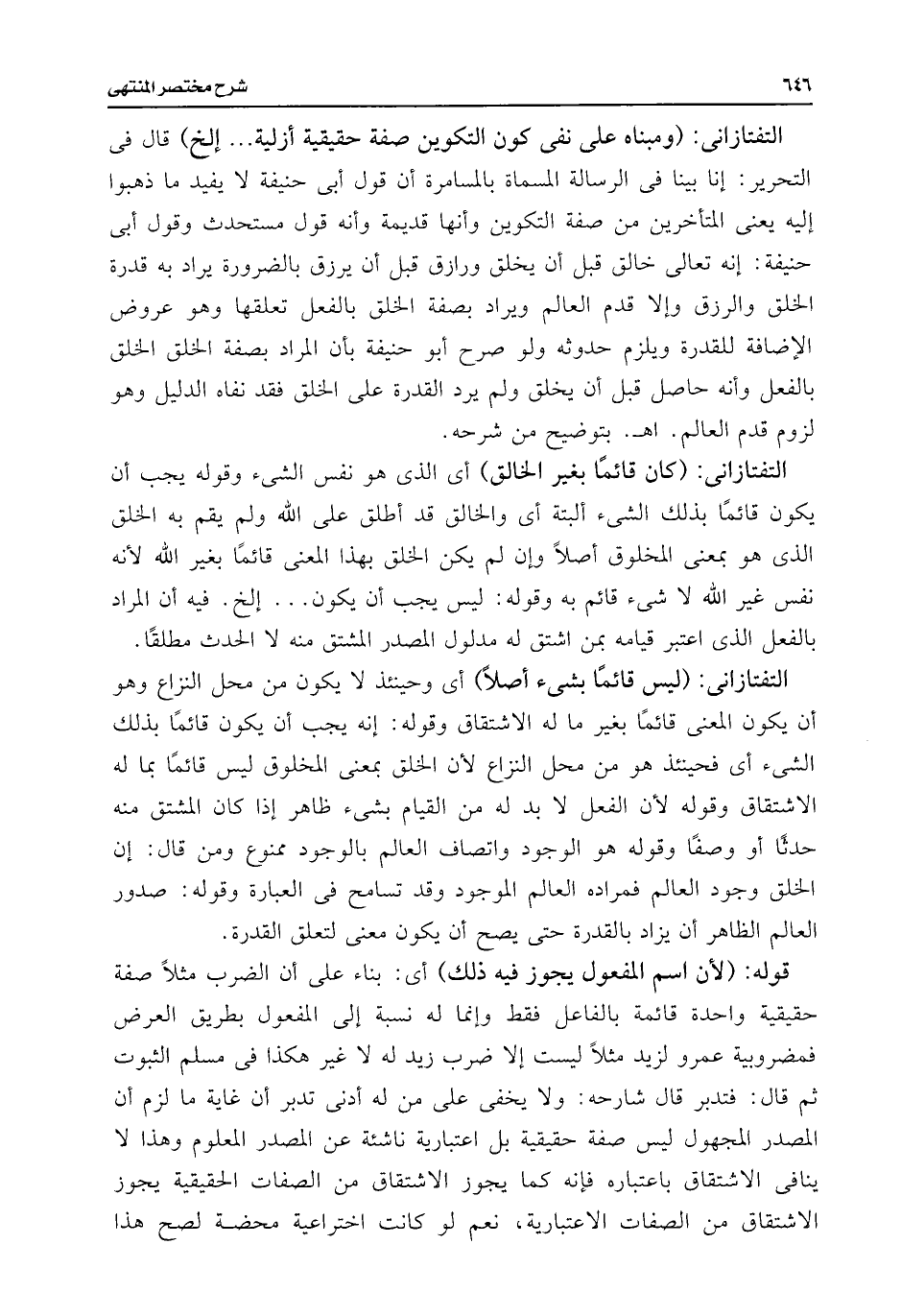 التفتازانى: (ليس قائما بشئ أصلًا) أى وحينئذ لا يكون من محل النزاع وهو أن يكون المعنى قائمًا بغير ما له الاشتقاق وقوله: إنه يجب أن يكون قائمًا بذلك الشئ أى فحينئذ هو من محل النزاع لأن الخلق: لمعنى المخلوق ليس قائمًا بما له الاشتقاق وقوله لأن الفعل لا بد له من القيام بشئ ظاهر إذا كان المشتق منه حدثًا أو وصفًا وقوله هو الوجود واتصاف العالم بالوجود ممنوع ومن قال: إن الخلق وجود العالم فمراده العالم الموجود وقد تسامح فى العبارة وقوله: صدور العالم الظاهر أن يزاد بالقدرة حتى يصح أن يكون معنى لتعلق القدرة.