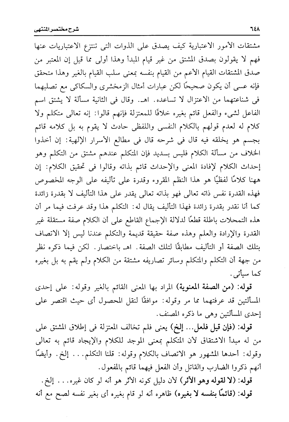 مشتقات الأمور الاعتبارية كيف يصدق على الذوات التى تنتزع الاعتباريات عنها فهم لا يقولون بصدق المشتق من غير قيام المبدأ وهذا أولى مما قيل إن المعتبر من صدق المشتقات القيام الأعم من القيام بنفسه بمعنى سلب القيام بالغير وهذا متحقق فإنه عسى أن يكون صحيحًا لكن عبارات أمثال الزمخشرى والسكاكى مع تصلبهما فى شناعتهما من الاعتزال لا تساعده. اهـ. وقال فى الثانية مسألة لا يشتق اسم الفاعل لشئ والفعل قائم بغيره خلافًا للمعتزلة فإنهم قالوا: إنه تعالى متكلم ولا كلام له لعدم قولهم بالكلام النفسى واللفظى حادث لا يقوم به بل كلامه قائم بجسم هو يخلقه فيه قال فى شرحه قال فى مطالع الأسرار الإلهية: إن أخذوا الخلاف من مسألة الكلام فليس بسديد فإن المتكلم عندهم مشتق من التكلم وهو إحداث الكلام لإفادة المعنى والإحداث قائم بذاته وقالوا فى تحقيق الكلام: إن ههنا كلامًا لفظيًا هو هذا النظم المقروء وقدرة على تأليفه على الوجه المخصوص فهذه القدرة نفس ذاته تعالى فهو بذاته تعالى يقدر على هذا التأليف لا بقدرة زائدة كما أنا نقدر بقدرة زائدة فهذا التأليف يقال له: التكلم هذا وقد عرفت فيما مر أن هذه التمحلات باطلة قطعًا لدلالة الإجماع القاطع على أن الكلام صفة مستقلة غير القدرة والإرادة والعلم وهذه صفة حقيقة قديمة والتكلم عندنا ليس إلا الاتصاف بتلك الصفة أو التأليف مطابقًا لتلك الصفة. اهـ باختصار. لكن فيما ذكره نظر من جهة أن التكلم والمتكلم وسائر تصاريفه مشتقة من الكلام ولم يقم به بل بغيره كما سيأتى.