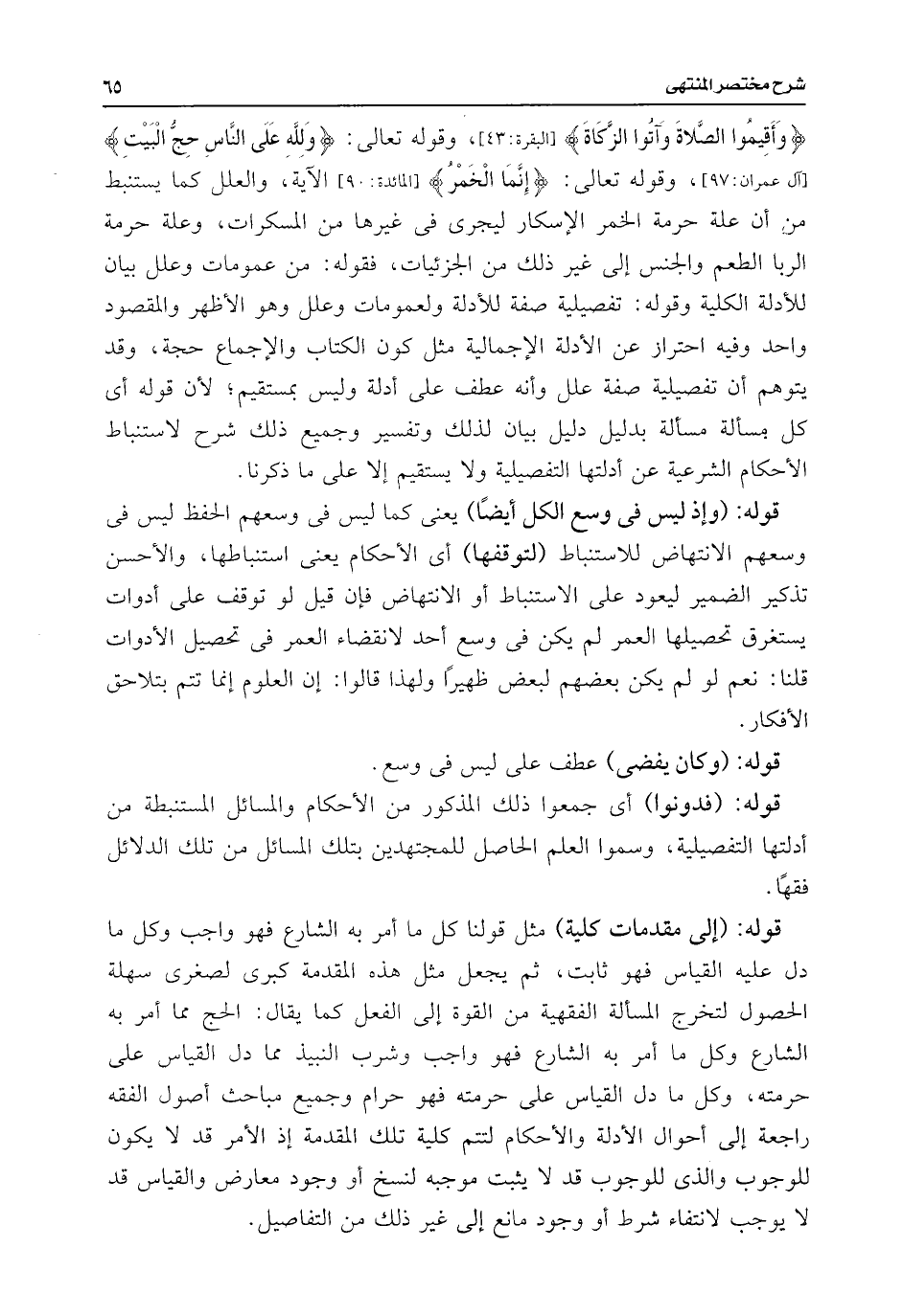 {وَأَقِيمُوا الصَّلَاةَ وَآتُوا الزَّكَاةَ} [البقرة: ٤٣]، وقوله تعالى: {وَلِلَّهِ عَلَى النَّاسِ حِجُّ الْبَيْتِ} [آل عمران: ٩٧]، وقوله تعالى: {إِنَّمَا الْخَمْرُ} [المائدة: ٩٠] الآية، والعلل كما يستنبط من أن علة حرمة الخمر الإسكار ليجرى فى غيرها من المسكرات، وعلة حرمة الربا الطعم والجنس إلى غير ذلك من الجزئيات، فقوله: من عمومات وعلل بيان للأدلة الكلية وقوله: تفصيلية صفة للأدلة ولعمومات وعلل وهو الأظهر والمقصود واحد وفيه احتراز عن الأدلة الإجمالية مثل كون الكتاب والإجماع حجة، وقد يتوهم أن تفصيلية صفة علل وأنه عطف على أدلة وليس بمستقيم؛ لأن قوله أى كل مسألة مسألة بدليل دليل بيان لذلك وتفسير وجميع ذلك شرح لاستنباط الأحكام الشرعية عن أدلتها التفصيلية ولا يستقيم إلا على ما ذكرنا.