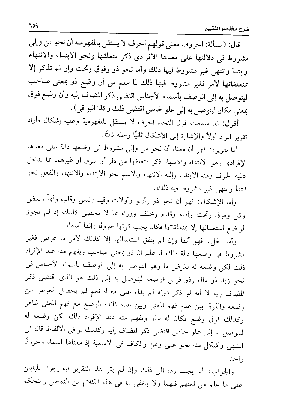 قال: (مسألة: الحروف معنى قولهم الحرف لا يستقل بالمفهومية أن نحو من وإلى مشروط فى دلالتها على معناها الإفرادى ذكر متعلقها ونحو الابتداء والانتهاء وابتدأ وانتهى غير مشروط فيها ذلك وأما نحو ذو وفوق وتحت وإن لم تذكر إلا بمتعلقاتها لأمر فغير مشروط فيها ذلك لما علم من أن وضع ذو بمعنى صاحب ليتوصل به إلى الوصف بأسماء الأجناس اقتضى ذكر المضاف إليه وأن وضع فوق بمعنى مكان ليتوصل به إلى علو خاص اقتضى ذلك وكذا البواقى).