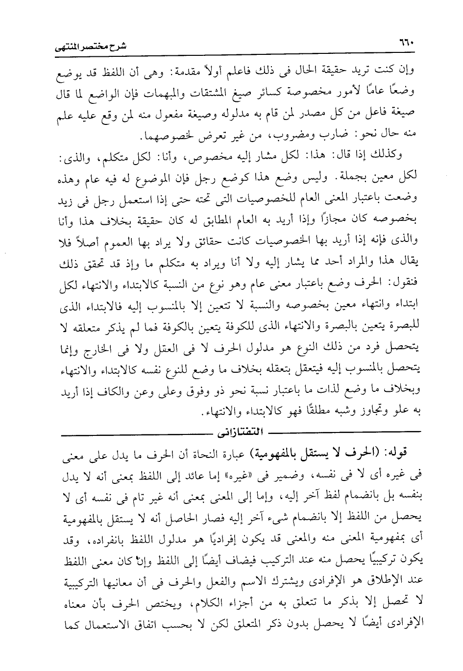 وكذلك إذا قال: هذا: لكل مشار إليه مخصوص، وأنا: لكل متكلم، والذى: لكل معين بجملة. وليس وضع هذا كوضع رجل فإن الموضوع له فيه عام وهذه وضعت باعتبار المعنى العام للخصوصيات التى تحته حتى إذا استعمل رجل فى زيد بخصوصه كان مجازًا وإذا أريد به العام المطابق له كان حقيقة بخلاف هذا وأنا والذى فإنه إذا أريد بها الخصوصيات كانت حقائق ولا يراد بها العموم أصلًا فلا يقال هذا والمراد أحد مما يشار إليه ولا أنا ويراد به متكلم ما وإذ قد تحقق ذلك فنقول: الحرف وضع باعتبار معنى عام وهو نوع من النسبة كالابتداء والانتهاء لكل ابتداء وانتهاء معين بخصوصه والنسبة لا تتعين إلا بالمنسوب إليه فالابتداء الذى للبصرة بتعين بالبصرة والانتهاء الذى للكوفة يتعين بالكوفة فما لم يذكر متعلقه لا يتحصل فرد من ذلك النوع هو مدلول الحرف لا فى العقل ولا فى الخارج وإنما يتحصل بالمنسوب إليه فيتعقل بتعقله بخلاف ما وضع للنوع نفسه كالابتداء والانتهاء وبخلاف ما وضع لذات ما باعتبار نسبة نحو ذو وفوق وعلى وعن والكاف إذا أريد به علو وتجاوز وشبه مطلقًا فهو كالابتداء والانتهاء.