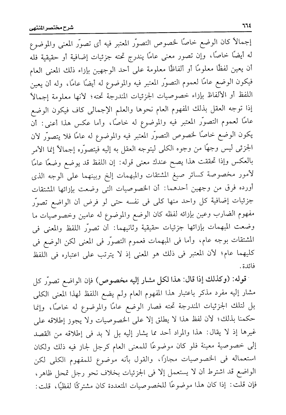 إجمالًا كان الوضع خاصًا لخصوص التصوّر المعتبر فيه أى تصوّر المعنى والموضوع له أيضًا خاصًا، وإن تصور معنى علمًا يندرج تحته جزئيات إضافية أو حقيقية فله أن يعين لفظًا معلومًا أو ألفاظًا معلومة على أحد الوجهين بإزاء ذلك المعنى العام فيكون الوضع عامًا لعموم التصوّر المعتبر فيه والموضوع له أيضًا عامًا، وله أن يعين اللفظ أو الألفاظ بإزاء خصوصيات الجزئيات المندرجة تحته؛ لأنها معلومة إجمالًا إذا توجه العقل بذلك المفهوم العام نحوها والعلم الإجمالى كاف فيكون الوضع عامًا لعموم التصوّر المعتبر فيه والموضوع له خاصًا، وأما عكس هذا أعنى: أن يكون الوضع خاصًا لخصوص التصوّر المعتبر فيه والموضوع له عامًا فلا يتصوّر لأن الجزئى ليس وجهًا من وجوه الكلى ليتوجه العقل به إليه فيتصوّره إجمالًا إنما الأمر بالعكس وإذا تحققت هذا يصح عندك معنى قوله: إن اللفظ قد يوضع وضعًا عامًا لأمور مخصوصة كسائر صيغ المشتقات والمبهمات إلخ وبينهما على الوجه الذى أورده فوق من وجهين أحدهما: أن الخصوصيات التى وضعت بإزائها المشتقات جزئيات إضافية كل واحد منها كلى فى نفسه حتى لو فرض أن الواضع تصوّر مفهوم الضارب وعين بإزائه لفظه بيان الوضع والموضوع له عامين وخصوصيات ما وضعت المبهمات بإزائها جزئيات حقيقية وثانيهما: أن تصور اللفظ والمعنى فى المشتقات بوجه عام، وأما فى المبهمات فعموم التصوّر فى المعنى لكن الوضع فى كليهما عام؛ لأن المعتبر فى ذلك هو المعنى إذ لا يترتب على اعتباره فى اللفظ فائدة.