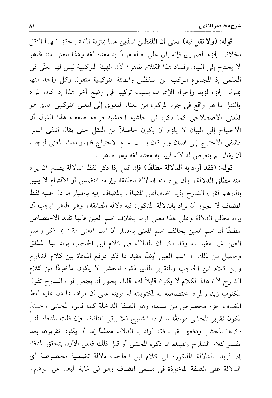 قوله: (فقد أراد به الدلالة مطلقًا) فإن قيل إذا ذكر لفظ الدلالة يصح أن يراد منه مطلق الدلالة، وأن يراد منه الدلالة المطابقة وإرادة التضمن أو الالتزام لا يليق بالتوهم فقول الشارح يفيد اختصاص المضاف بالمضاف إليه باعتبار ما دل عليه لفظ المضاف لا يجوز أن يراد بالدلالة المذكورة فيه دلالة المطابقة، وهو ظاهر فيجب أن يراد مطلق الدلالة وعلى هذا معنى قوله بخلاف اسم العين فإنها تفيد الاختصاص مطلقًا أن اسم العين يخالف اسم المعنى باعتبار أن اسم المعنى مقيد بما ذكر واسم العين غير مقيد به وقد ذكر أن الدلالة فى كلام ابن الحاجب يراد بها المطلق وحصل من ذلك أن اسم العين أيضًا مقيد بما ذكر فوقع المنافاة بين كلام الشارح وبين كلام ابن الحاجب والتقرير الذى ذكره المحشى لا يكون مأخوذًا من كلام الشارح لأن هذا الكلام لا يكون قابلًا له، قلنا: يجوز أن يجعل قول الشارح تقول مكتوب زيد والمراد اختصاصه به لمكتوبيته له قرينة على أن مراده بما دل عليه لفظ المضاف جزء مخصوص من مسماه وهو الصفة الداخلة كما فسره المحشى وحينئذٍ يكون تقرير المحشى موافقًا لما أراده الشارح فلا يبقى المنافاة، فإن قلت المنافاة التى ذكرها المحشى ودفعها بقوله فقد أراد به الدلالة مطلقًا إما أن يكون تقريرها بعد تفسير كلام الشارح وتقييده بما ذكره المحشى أو قبل ذلك فعلى الأول يتحقق المنافاة إذا أريد بالدلالة المذكورة فى كلام ابن الحاجب دلالة تضمنية مخصوصة أى الدلالة على الصفة المأخوذة فى مسمى المضاف وهو فى غاية البعد عن الوهم،