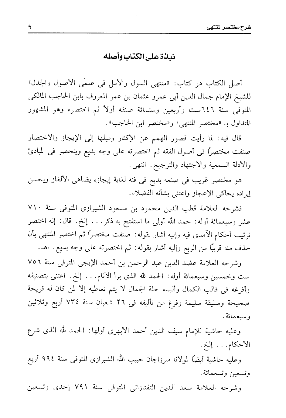 أصل الكتاب هو كتاب: "منتهى السول والأمل فى علمَى الأصول والجدل" للشيخ الإمام جمال الدين أبى عمرو عثمان بن عمر المعروف بابن الحاجب المالكى المتوفى سنة ٦٤٦ ست وأربعين وستمائة صنفه أولًا ثم اختصره وهو المشهور المتداول بـ "مختصر المنتهى" و"مختصر ابن الحاجب".