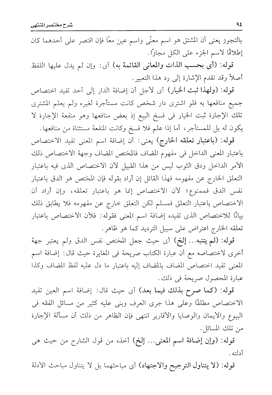 قوله: (كما صرح بذلك فيما بعد) أى حيث قال: إضافة اسم العين تفيد الاختصاص مطلقًا وعلى هذا جرى العرف وبنى عليه كتير من مسائل الفقه فى البيوع والأيمان والوصايا والأقارير انتهى فإن الظاهر من ذلك أن مسألة الإجارة من تلك المسائل.