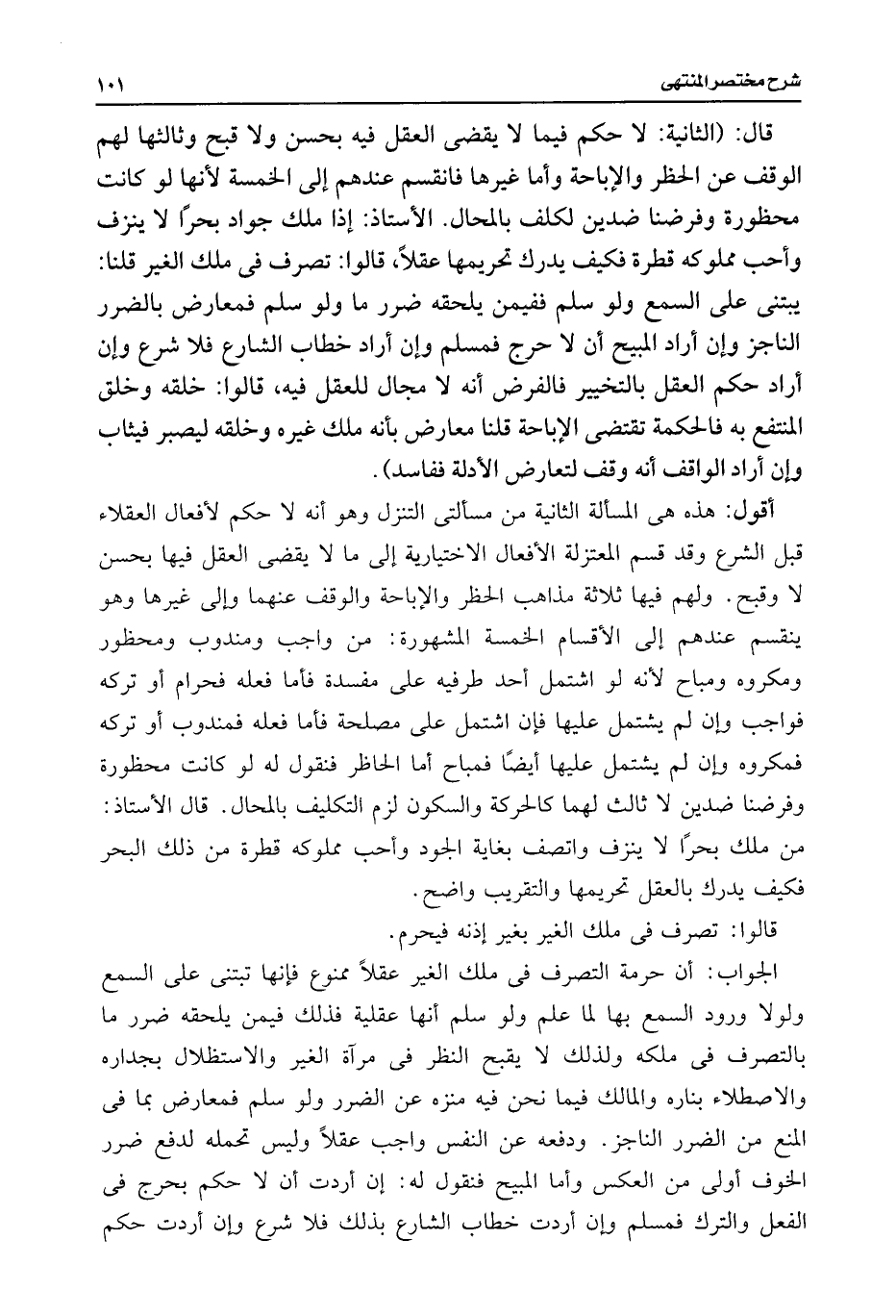قال: (الثانية: لا حكم فيما لا يقضى العقل فيه بحسن ولا قبح وثالثها لهم الوقف عن الحظر والإباحة وأما غيرها فانقسم عندهم إلى الخمسة لأنها لو كانت محظورة وفرضنا ضدين لكلف بالمحال. الأستاذ: إذا ملك جواد بحرًا لا ينزف وأحب مملوكه قطرة فكيف يدرك تحريمها عقلًا، قالوا: تصرف فى ملك الغير قلنا: يبتنى على السمع ولو سلم ففيمن يلحقه ضرر ما ولو سلم فمعارض بالضرر الناجز وإن أراد المبيح أن لا حرج فمسلم وإن أراد خطاب الشارع فلا شرع وإن أراد حكم العقل بالتخيير فالفرض أنه لا مجال للعقل فيه، قالوا: خلقه وخلق المنتفع به فالحكمة تقتضى الإباحة قلنا معارض بأنه ملك غيره وخلقه ليصبر فيثاب وإن أراد الواقف أنه وقف لتعارض الأدلة ففاسد).