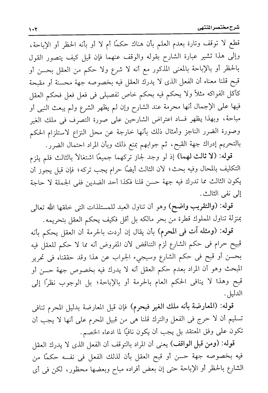 قطع لا توقف وتارة بعدم العلم بأن هناك حكمًا أم لا أو بأنه الحظر أو الإباحة، وإلى هذا تشير عبارة الشارح بقوله والوقف عنهما فإن قيل كيف يتصور القول بالحظر أو بالإباحة بالمعنى المذكور مع أنه لا شرع ولا حكم من العقل بحسن أو قبح قلنا معناه أن الفعل الذى لا يدرك العقل فيه بخصوصه جهة محسنة أو مقبحة كأكل الفواكه مثلًا ولا يحكم فيه بحكم خاص تفصيلى فى فعل فعل فحكم العقل فيها على الإجمال أنها محرمة عند الشارح وإن لم يظهر الشرع ولم يبعث النبى أو مباحة، وبهذا يظهر فساد اعتراض الشارحين على صورة التصرف فى ملك الغير وصورة الضرر الناجز وأمثال ذلك بأنها خارجة عن محل النزاع لاستلزام الحكم بالتحريم إدراك جهة القبح، ثم جوابهم بمنع ذلك وبأن المراد احتمال الضرر.