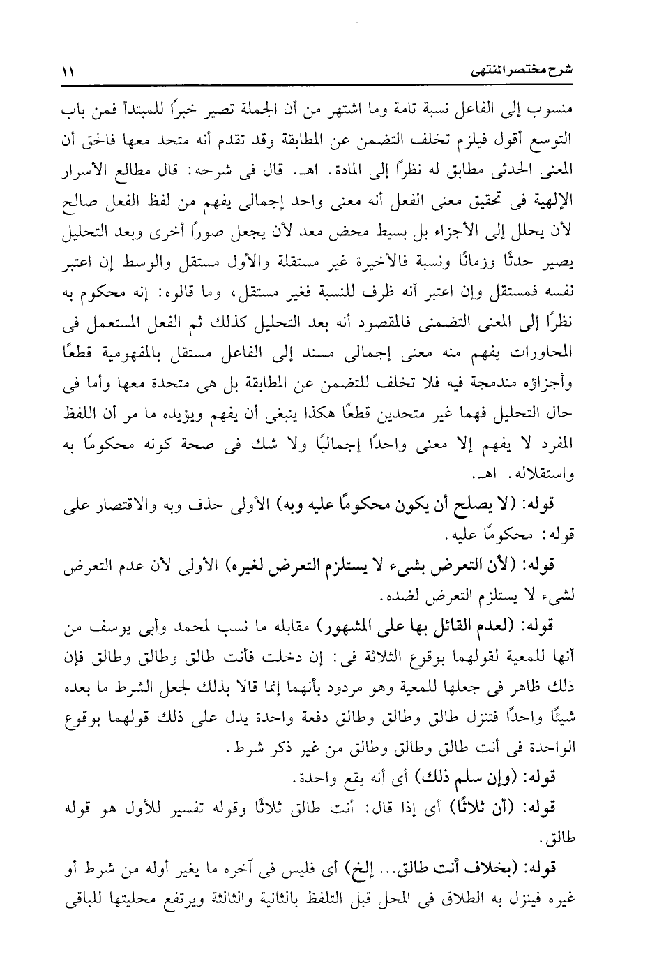 منسوب إلى الفاعل نسبة تامة وما اشتهر من أن الجملة تصير خبرًا للمبتدأ فمن باب التوسع أقول فيلزم تخلف التضمن عن المطابقة وقد تقدم أنه متحد معها فالحق أن المعنى الحدثى مطابق له نظرًا إلى المادة. اهـ. قال فى شرحه: قال مطالع الأسرار الإلهية فى تحقيق معنى الفعل أنه معنى واحد إجمالى يفهم من لفظ الفعل صالح لأن يحلل إلى الأجزاء بل بسيط محض لأن يجعل صورًا أخرى وبعد التحليل يصير حدثًا وزمانًا ونسبة فالأخيرة غير مستقلة والأول مستقل والوسط إن اعتبر نفسه فمستقل وإن اعتبر أنه ظرف للنسبة فغير مستقل، وما قالوه: إنه محكوم به نظرًا إلى المعنى التضمنى فالمقصود أنه بعد التحليل كذلك ثم الفعل المستعمل فى المحاورات يفهم منه معنى إجمالى مسند إلى الفاعل مستقل بالمفهومية قطعًا وأجزاؤه مندمجة فيه فلا تخلف للتضمن عن المطابقة بل هى متحدة معها وأما فى حال التحليل فهما غير متحدين قطعًا هكذا ينبغى أن يفهم ويؤيده ما مر أن اللفظ المفرد لا يفهم إلا معنى واحدًا إجماليًا ولا شك فى صحة كونه محكومًا به واستقلاله. اهـ.
