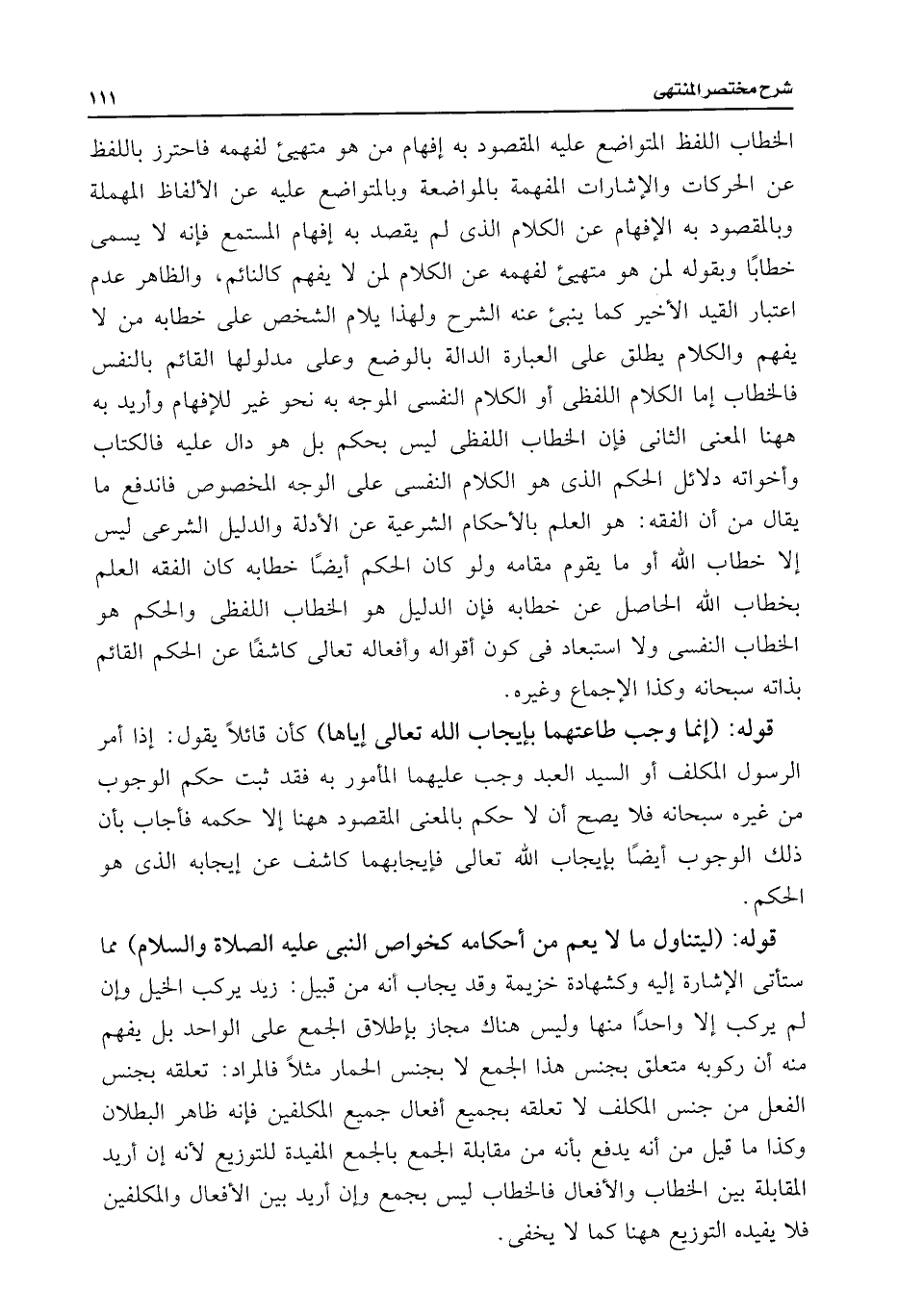 الخطاب اللفظ المتواضع عليه المقصود به إفهام من هو متهيئ لفهمه فاحترز باللفظ عن الحركات والإشارات المفهمة بالمواضعة وبالمتواضع عليه عن الألفاظ المهملة وبالمقصود به الإفهام عن الكلام الذى لم يقصد به إفهام المستمع فإنه لا يسمى خطابًا وبقوله لمن هو متهيئ لفهمه عن الكلام لمن لا يفهم كالنائم، والظاهر عدم اعتبار القيد الأخير كما ينبئ عنه الشرح ولهذا يلام الشخص على خطابه من لا يفهم والكلام يطلق على العبارة الدالة بالوضع وعلى مدلولها القائم بالنفس فالخطاب إما الكلام اللفظى أو الكلام النفسى الموجه به نحو غير للإفهام وأريد به ههنا المعنى الثانى فإن الخطاب اللفظى ليس بحكم بل هو دال عليه فالكتاب وأخواته دلائل الحكم الذى هو الكلام النفسى على الوجه المخصوص فاندفع ما يقال من أن الفقه: هو العلم بالأحكام الشرعية عن الأدلة والدليل الشرعى ليس إلا خطاب اللَّه أو ما يقوم مقامه ولو كان الحكم أيضًا خطابه كان الفقه العلم بخطاب اللَّه الحاصل عن خطابه فإن الدليل هو الخطاب اللفظى والحكم هو الخطاب النفسى ولا استبعاد فى كون أقواله وأفعاله تعالى كاشفًا عن الحكم القائم بذاته سبحانه وكذا الإجماع وغيره.