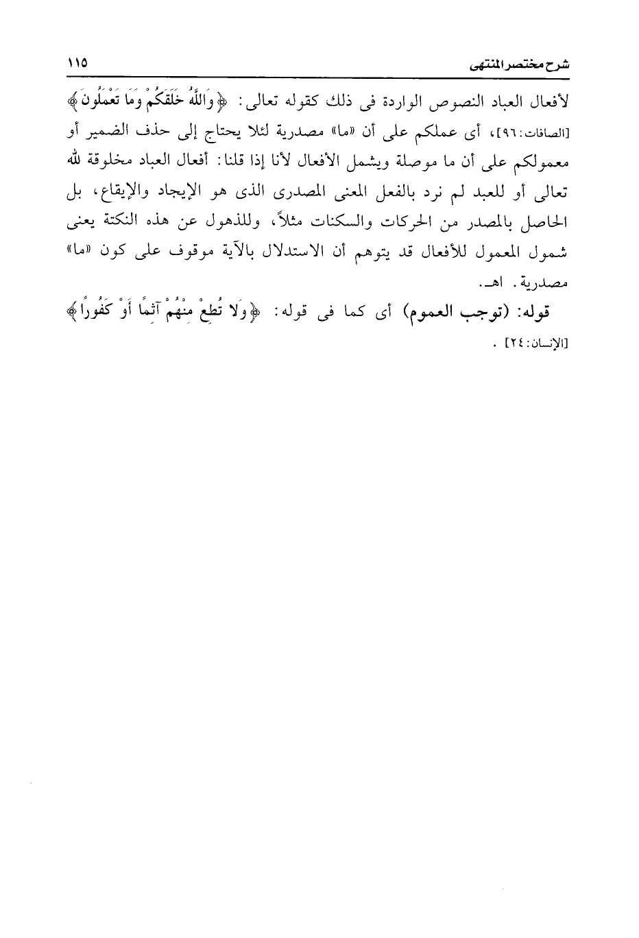 لأفعال العباد النصوص الواردة فى ذلك كقوله تعالى: {وَاللَّهُ خَلَقَكُمْ وَمَا تَعْمَلُونَ} [الصافات: ٩٦]، أى عملكم على أن "ما" مصدرية لئلا يحتاج إلى حذف الضمير أو معمولكم على أن ما موصلة ويشمل الأفعال لأنا إذا قلنا: أفعال العباد مخلوقة للَّه تعالى أو للعبد لم نرد بالفعل المعنى المصدرى الذى هو الإيجاد والإيقاع، بل الحاصل بالمصدر من الحركات والسكنات مثلًا، وللذهول عن هذه النكتة يعنى شمول المعمول للأفعال قد يتوهم أن الاستدلال بالآية موقوف على كون "ما" مصدرية. اهـ.