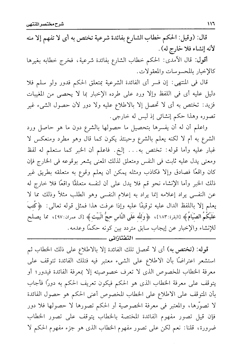 قال فى المنتهى: إن فسر أى الفائدة الشرعية بمتعلق الحكم فدور ولو سلم فلا دليل عليه أى فى اللفظ وإلا ورد على طرده الإخبار بما لا يحصى من المغيبات فزيد: تختص به أى لا تحصل إلا بالاطلاع عليه ولا دور لأن حصول الشئ غير تصوره وهذا حكم إنشائى إذ ليس له خارجى.