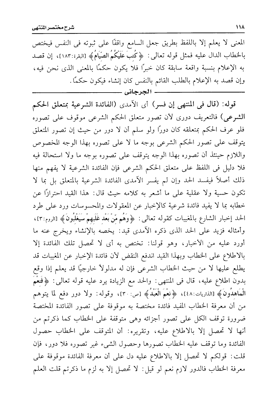 قوله: (قال فى المنتهى إن فسر) أى الآمدى (الفائدة الشرعية بمتعلق الحكم الشرعى) فالتعريف دورى لأن تصور متعلق الحكم الشرعى موقوف على تصوره فلو عرف الحكم بمتعلقه كان دورًا ولو سلم أن لا دور من حيث إن تصور المتعلق يتوقف على تصور الحكم الشرعى بوجه ما لا على تصوره بهذا الوجه المخصوص واللازم حينئذ أن تصوره بهذا الوجه يتوقف على تصوره بوجه ما ولا استحالة فيه فلا دليل فى اللفظ على متعلق الحكم الشرعى فإن الفائدة الشرعية لا يفهم منها ذلك أصلًا فيفسد الحد وإن لم يفسد الآمدى الفائدة الشرعية بالمتعلق بل بما لا تكون حسية ولا عقلية على ما أشعر به كلامه حيث قال: هذا القيد احترازًا عن خطابه بما لا يفيد فائدة شرعية كالإخبار عن المعقولات والمحسوسات ورد على طرد الحد إخبار الشارع بالمغيبات كقوله تعالى: {وَهُمْ مِنْ بَعْدِ غَلَبِهِمْ سَيَغْلِبُونَ} [الروم: ٣]، وأمثاله فزيد على الحد الذى ذكره الآمدى ى قيد: يخصه بالإنشاء ويخرج عنه ما أورد عليه من الأخبار، وهو قولنا: تختص به أى لا تحصل تلك الفائدة إلا بالاطلاع على الخطاب وبهذا القيد اندفع النقض لأن فائدة الإخبار عن المغيبات قد يطلع عليها لا من حيث الخطاب الشرعى فإن له مدلولًا خارجيًا قد يعلم إذا وقع بدون اطلاع عليه، قال فى المنتهى: والحد مع الزيادة يرد عليه قوله تعالى: {فَنِعْمَ الْمَاهِدُونَ} [الذاريات: ٤٨]، {نِعْمَ الْعَبْدُ} [ص: ٣٠]، وقوله: ولا دور دفع لما يتوهم من أن معرفة الخطاب المفيد فائدة مختصة به موقوفة على تصور الفائدة المختصة ضرورة توقف الكل على تصور أجزائه وهى متوقفة على الخطاب كما ذكرتم من أنها لا تحصل إلا بالاطلاع عليه، وتقريره: أن المتوقف على الخطاب حصول الفائدة وما توقف عليه الخطاب تصورها وحصول الشئ غير تصوره فلا دور، فإن قلت: قولكم لا تحصل إلا بالاطلاع عليه دل على أن معرفة الفائدة موقوفة على معرفة الخطاب فالدور لازم نعم لو قيل: لا تحصل إلا به لزم ما ذكرتم قلت العلم